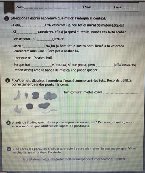 – En el ejercicio 1 tenéis que seleccionar el pronombre adecuado para la frase. Por ejemplo en la primera oración NO tiene sentido poner “Hola ells ja heu fet el mural de matemàtiques?” Sería adecuado poner Vosaltres.