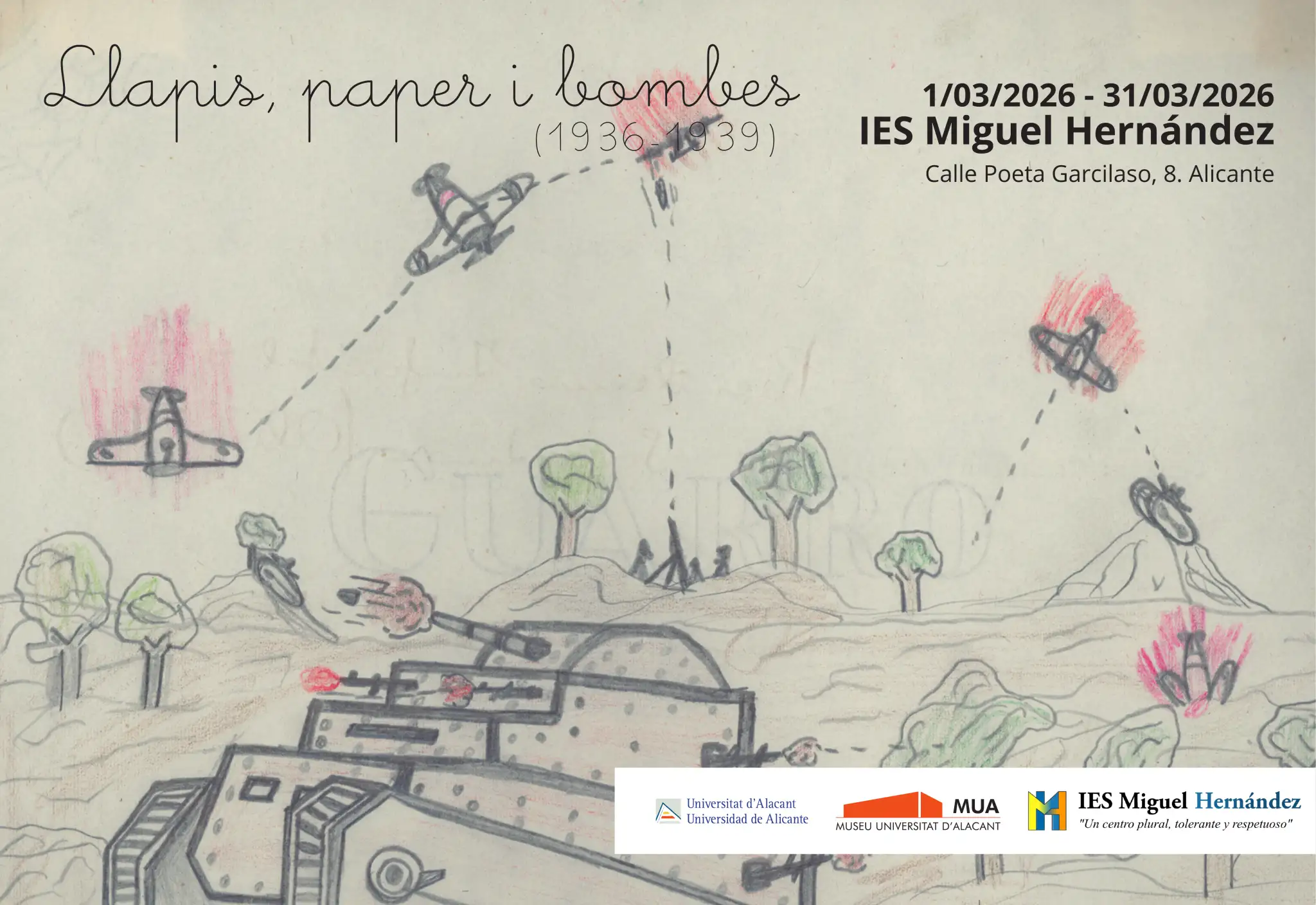 Durante el mes de marzo contaremos con la exposición Llapis, papers i bombes cedida por el MUA, una reflexión sobre el sufrimiento de las niñas y niños evacuados durante la Guerra Civil Española, a partir de los dibujos que ellos mismos realizaron y donde reflejan su experiencia.