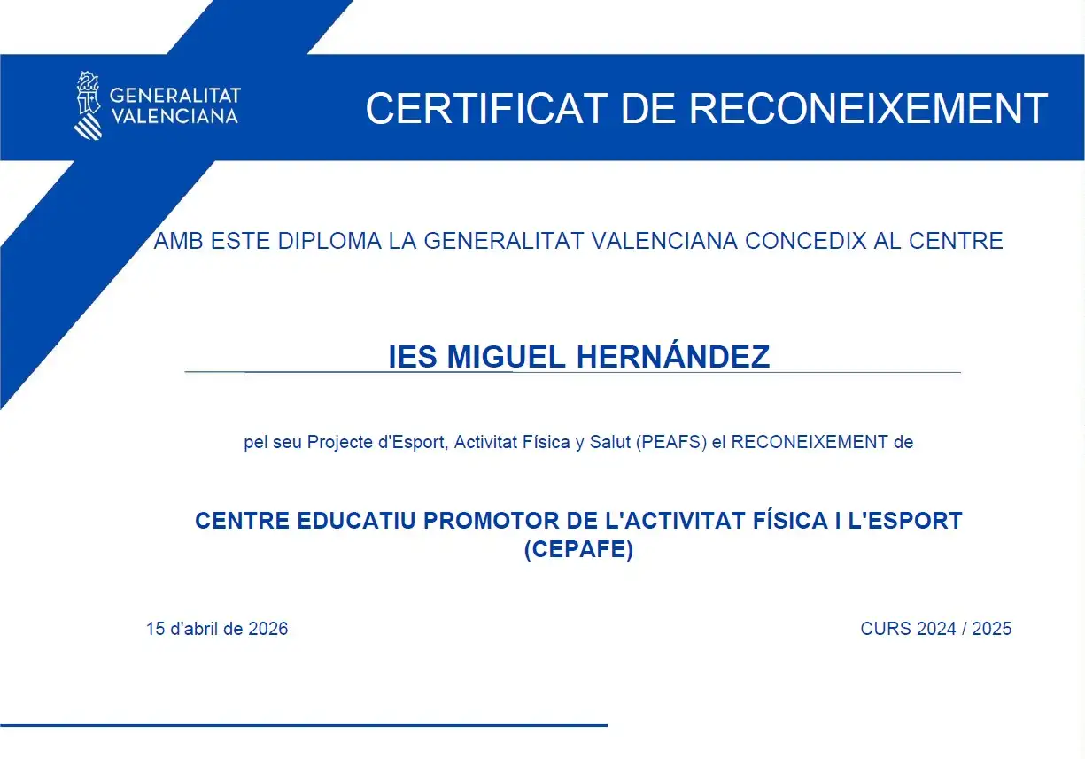 El pasado 30 de marzo, nuestro instituto se sumó a la celebración del Día de l’Esport, una iniciativa impulsada por la Fundación Trinidad Alfonso y dirigida a centros educativos de Primaria y Secundaria de la Comunitat Valenciana. Esta propuesta tiene como objetivo principal fomentar la actividad física y promover hábitos de vida saludables entre el … Leer más