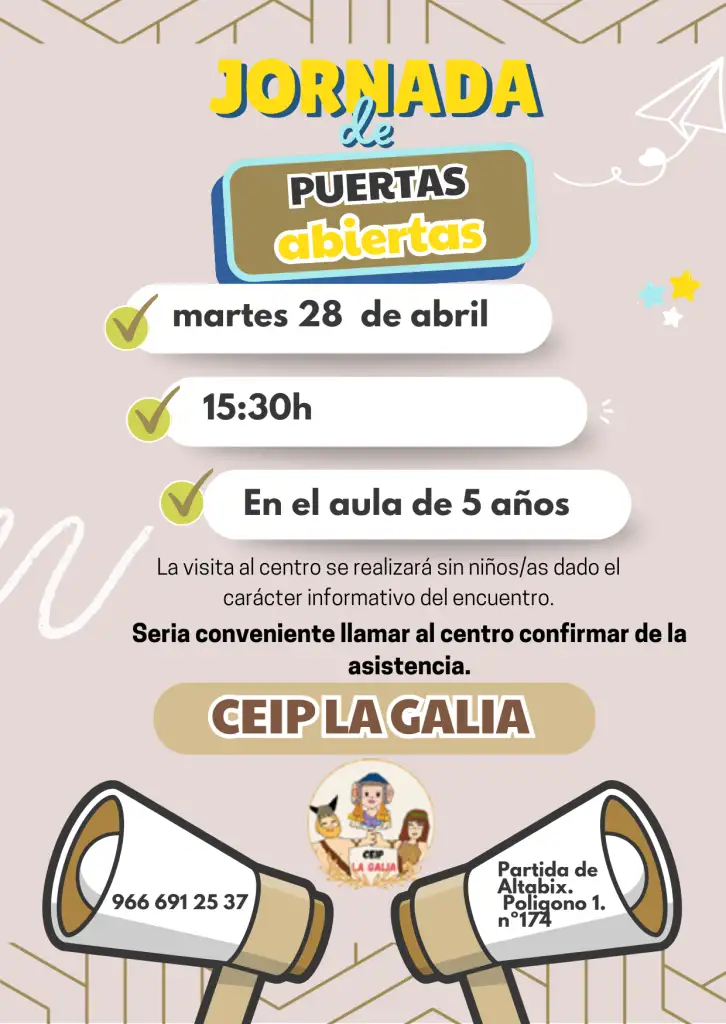 Este año el centro ha asignado el día martes 28 de abril, a partir de las 15.30, para la jornada de puertas abiertas en la cual cualquier familia, interesada a conocer nuestro colegio, podrá conocer como está distribuido y organizado. Además se intentará resolver todas las dudas que pueda llevar algún padre o madre.