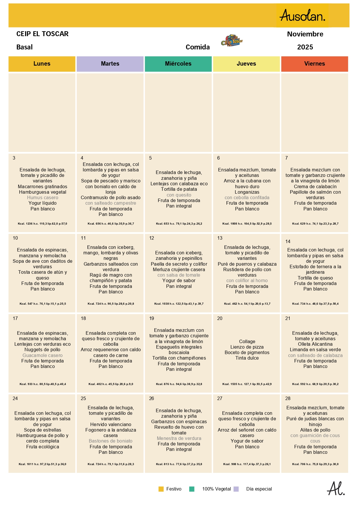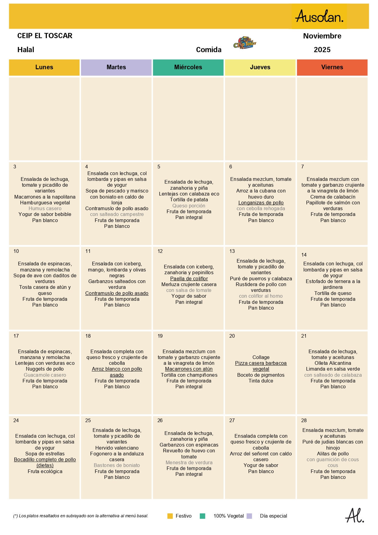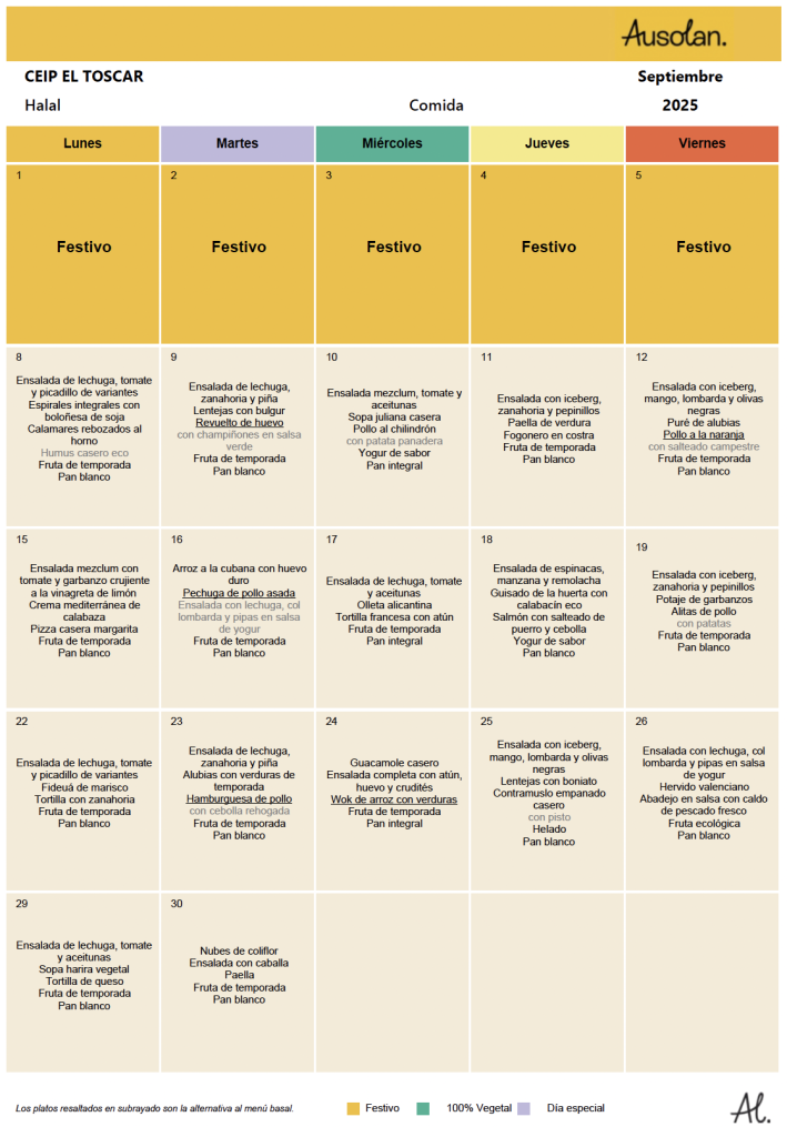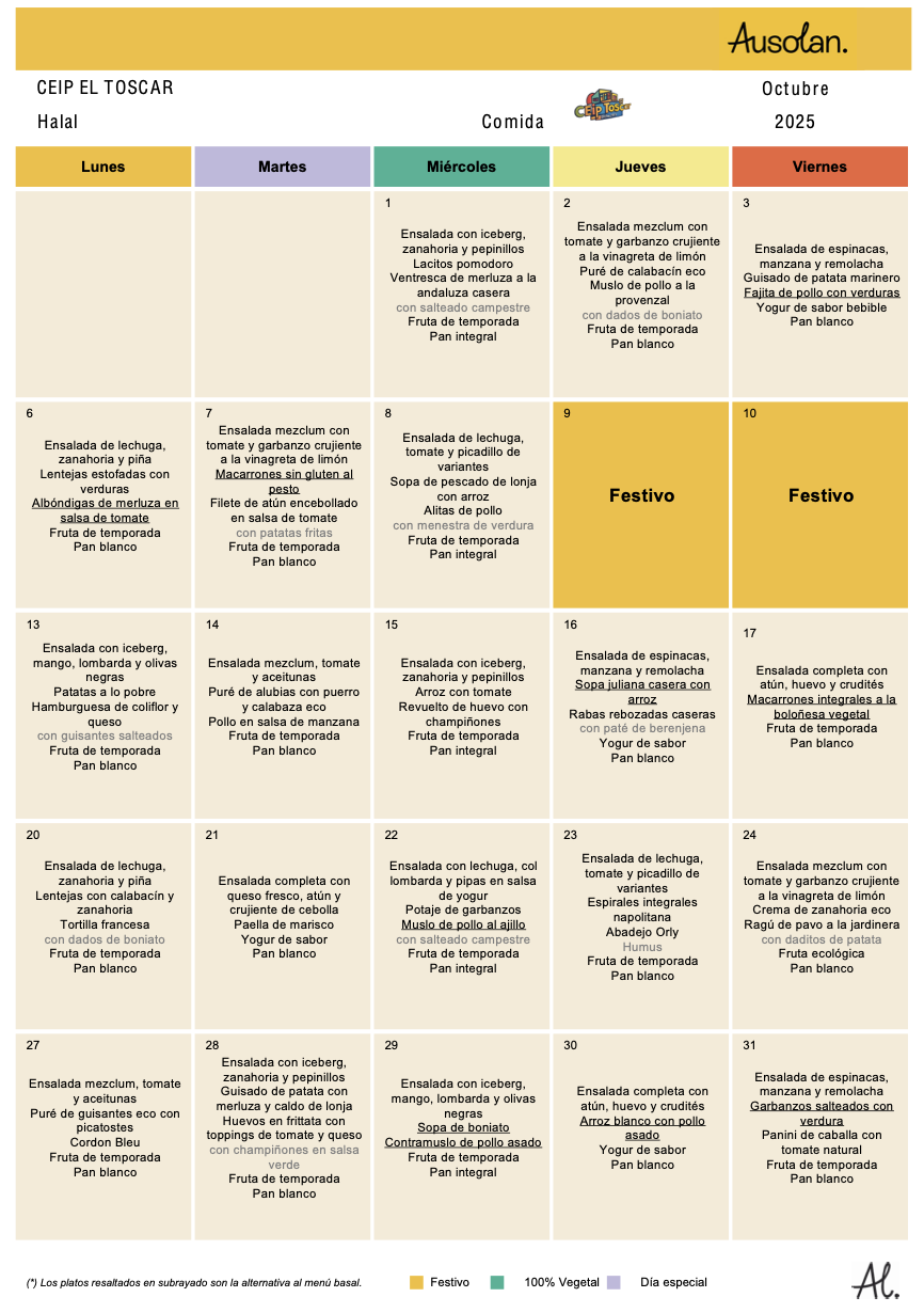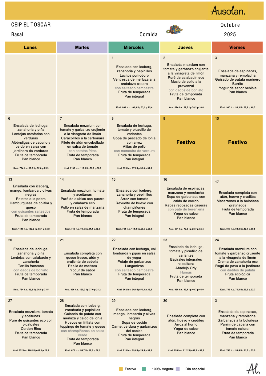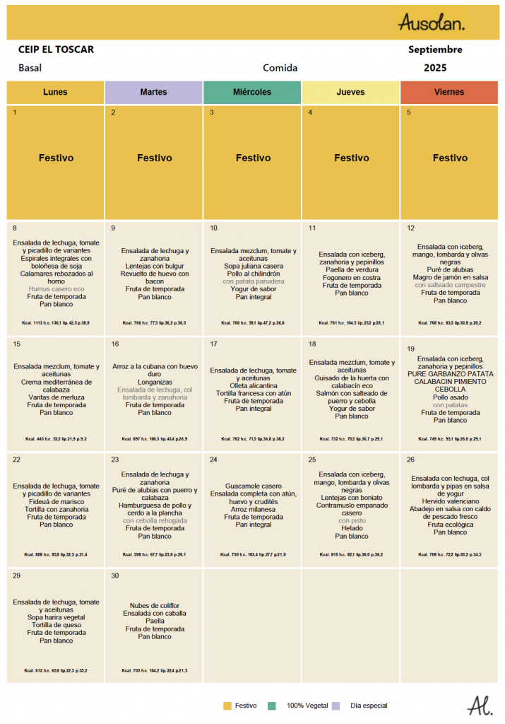 En este espacio colgaremos las variedades del menú equilibrado de los diferentes meses del curso escolar, ofrecido por la cooperativa AUSOLAN en el comedor de nuestra escuela.