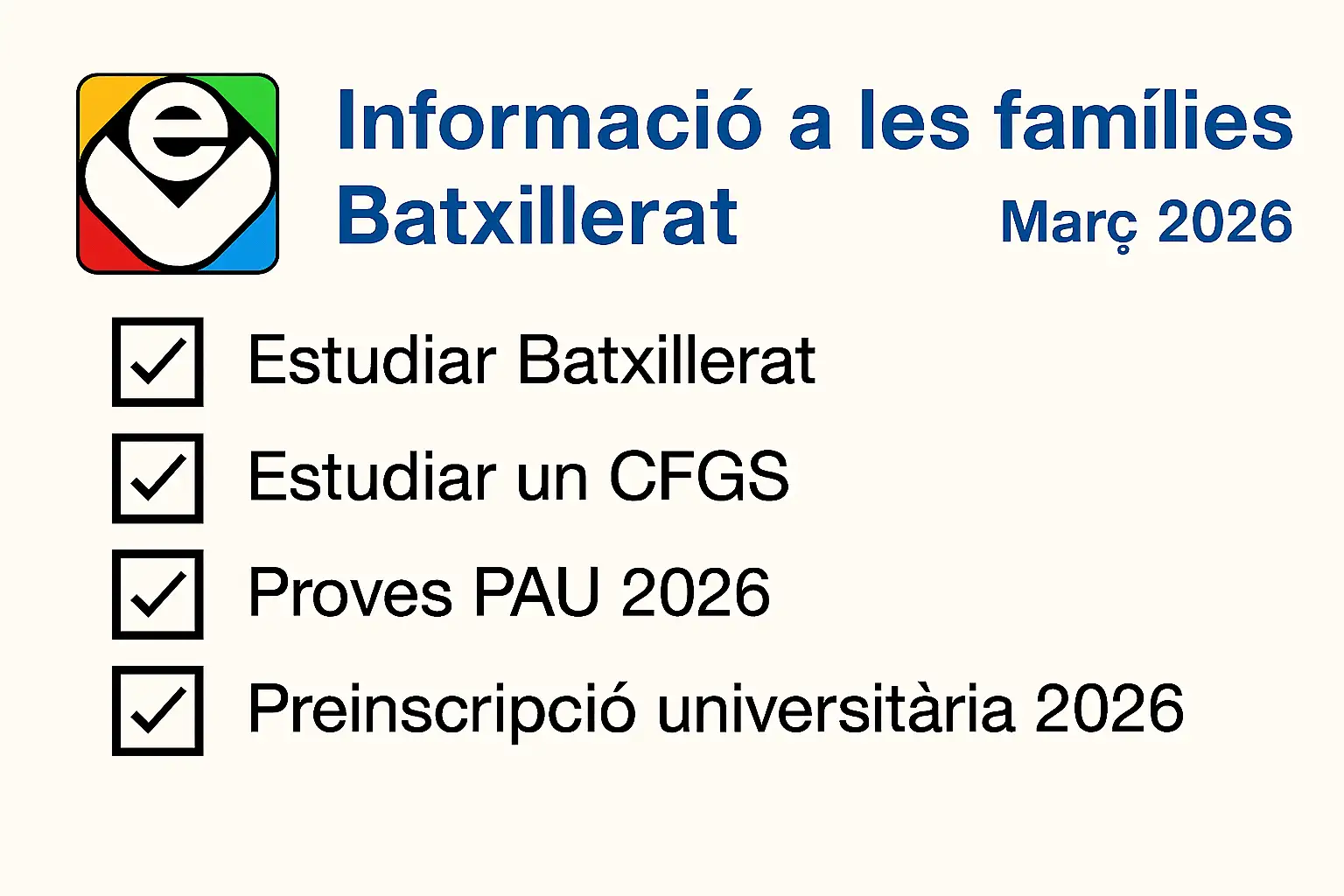 L’objectiu d’aquesta entrada és facilitar a les famílies tota la informació rellevant sobre el Batxillerat, les proves PAU 2026, l’accés a Cicles Formatius de Grau Superior i el procés de preinscripció universitària.