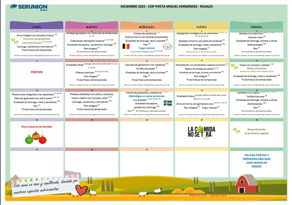 Aquí tenéis el menú basal del mes de diciembre. Si alguna familia desea conocer alguno de los distintos menús que prepara la empresa prestataria del servicio debe escribir un correo electrónico al centro y se lo facilitamos.