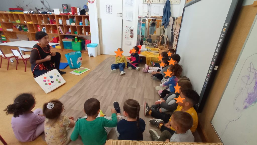Nos narran un cuento, jugamos a las adivinanzas y hacemos una brocheta de frutas.