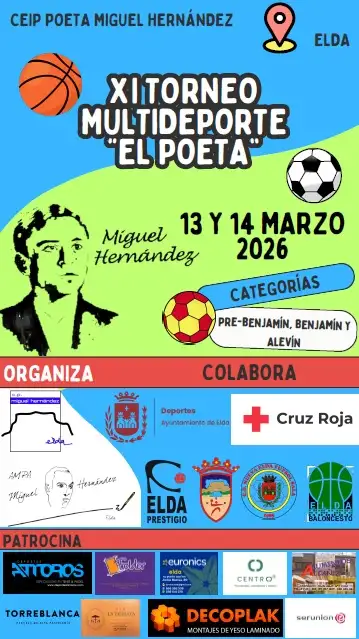 Como todos los años, “El torneo del poeta” vuelve a llenar las pistas de nuestro cole de deportistas incansables. Durante la tarde del viernes y la mañana del sábado nuestros alumnos jugarán partidos de diferentes deportes (fútbol, baloncesto y balonmano) a los que asistirán el resto de colegios de Elda. Durante esos días, podremos disfrutar de un buen bocata y un refresco a cargo de las familias de nuestros niños y niñas de 5º de primaria.