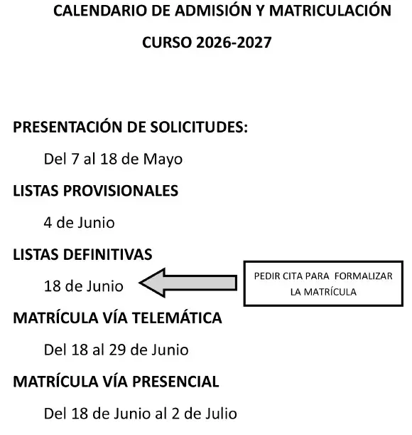 Nuestro centro informa a todas las familias interesadas en formar parte de nuestra comunidad educativa que ya se ha publicado el calendario del proceso de admisión y matriculación para el curso escolar 2026-2027.