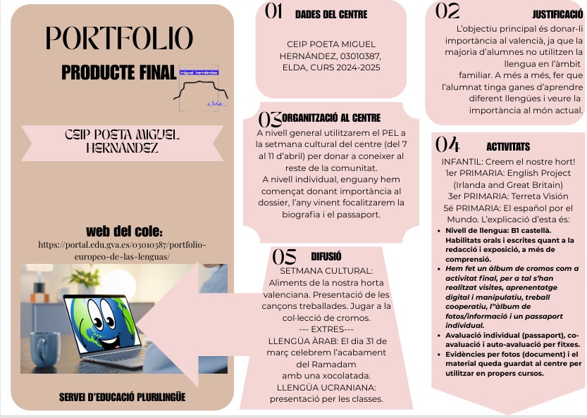 Al llarg del curs hem dut a terme diverses activitats relacionades amb la comunicació oral i escrita en valencià, castellà i altres llengües estrangeres. Com a tancament del projecte, estem molt contents de poder compartir amb tota la comunitat educativa els productes finals elaborats pels nostres alumnes. Aquests materials recullen els coneixements, habilitats i valors treballats, i reflecteixen l’esforç i la creativitat de l’alumnat.