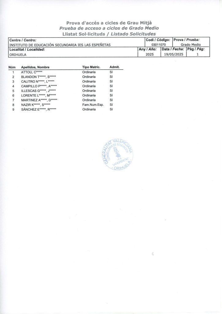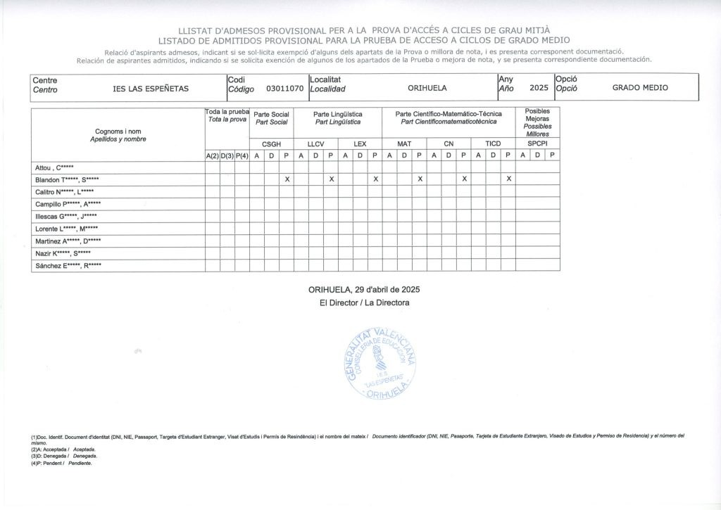 Publicación del listado provisional de alumnado admitido a las pruebas de acceso a ciclos. Grado Medio