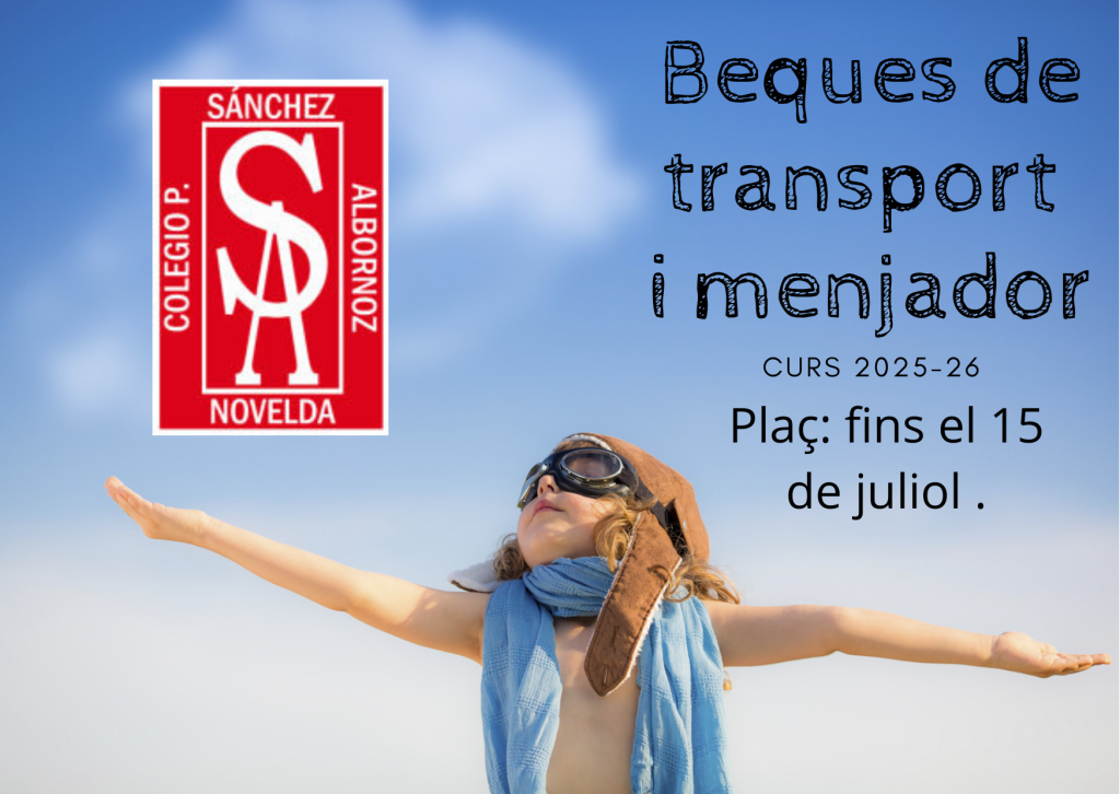 | Atenció! Beques de menjador i Transport Termini: fins al 23 de juliol al centre. Petició per Esborrany: ja podeu replegar l’esborrany de beca a la conserjería del centre. Revisa-ho, firma-ho (amb dos progenitors) i porta-ho al col.legi a consergeria de 9 a 12h . Sino és correcte, marca en la casella G, la qual cosano és correcta i aporta la documentació que ho acredite. De totes maneres podeu imprimir l’esborrany des de Webfamilia si teniu accés. Webfamilia: https://familia.edu.gva.es/wf-front/myitaca/login_wf?idioma=C Si el curs passat no vas demanar Beca, ompliu l’Anexo I i porta’l al col.legi juntament amb la documentació acreditativa. Petició Nova, ha de ser emplenada i posteriorment lliurada al col.legi juntament amb la documentació acreditativa. lliurar a consergeria de 9 a 12h. -No oblidis que en portar l’esborrany , si has de modificar-ne alguna cosa, has de portar la documentació que ho acrediti. Normativa i sol.licitud Annex I de Beques de Menjador i transport al següent enllaç: https://ceice.gva.es/es/web/centros-docentes/comedor/transporte Per qualsevol dubte, problema o circumstància: 966908150 03011690@edu.gva.es |