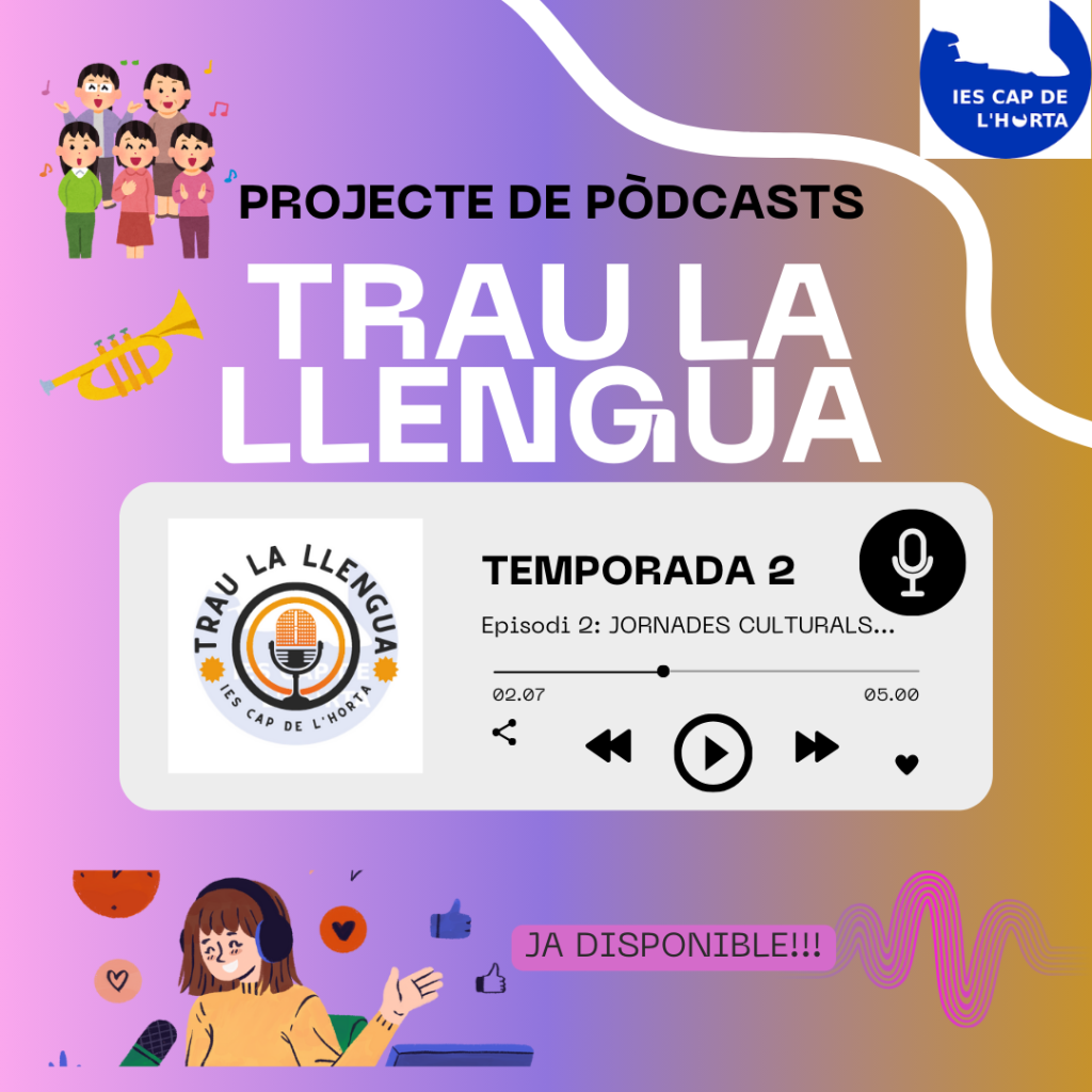 Ací teniu el segon episodi d’aquesta segona temporada de pòdcast! Concretament, en aquesta ocasió ens informaran sobre el funcionament de les Jornades Culturals del nostre centre i, a més, els nostres companys/es que han fet mobilitats a París i a Turín ens comentaran les seus impressions al respecte. Esteu preparats i preparades?