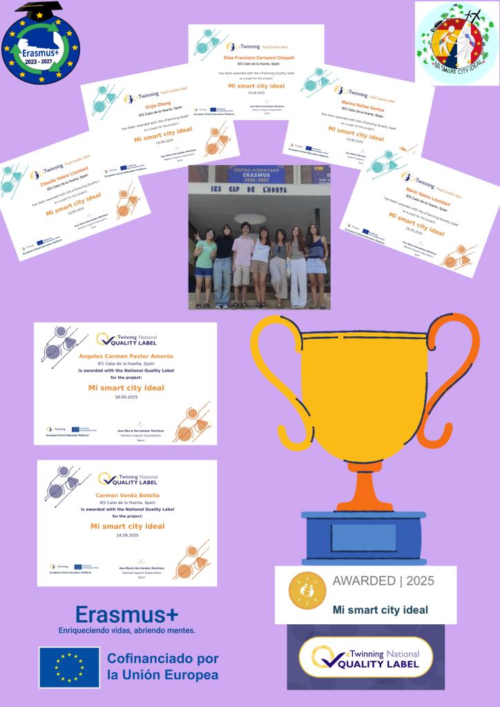 Una de las mejores maneras de empezar el curso es recibiendo el reconocimiento al trabajo en equipo. Las profesoras Ángeles Pastor y Carmen Verdú, junto con el alumnado de 1° de Bachillerato que participó en el proyecto Erasmus “Mi smart city ideal”, han recibido el Sello de Calidad eTwinning por su trabajo. El esfuerzo continuado durante todo un año ha dado sus frutos.
