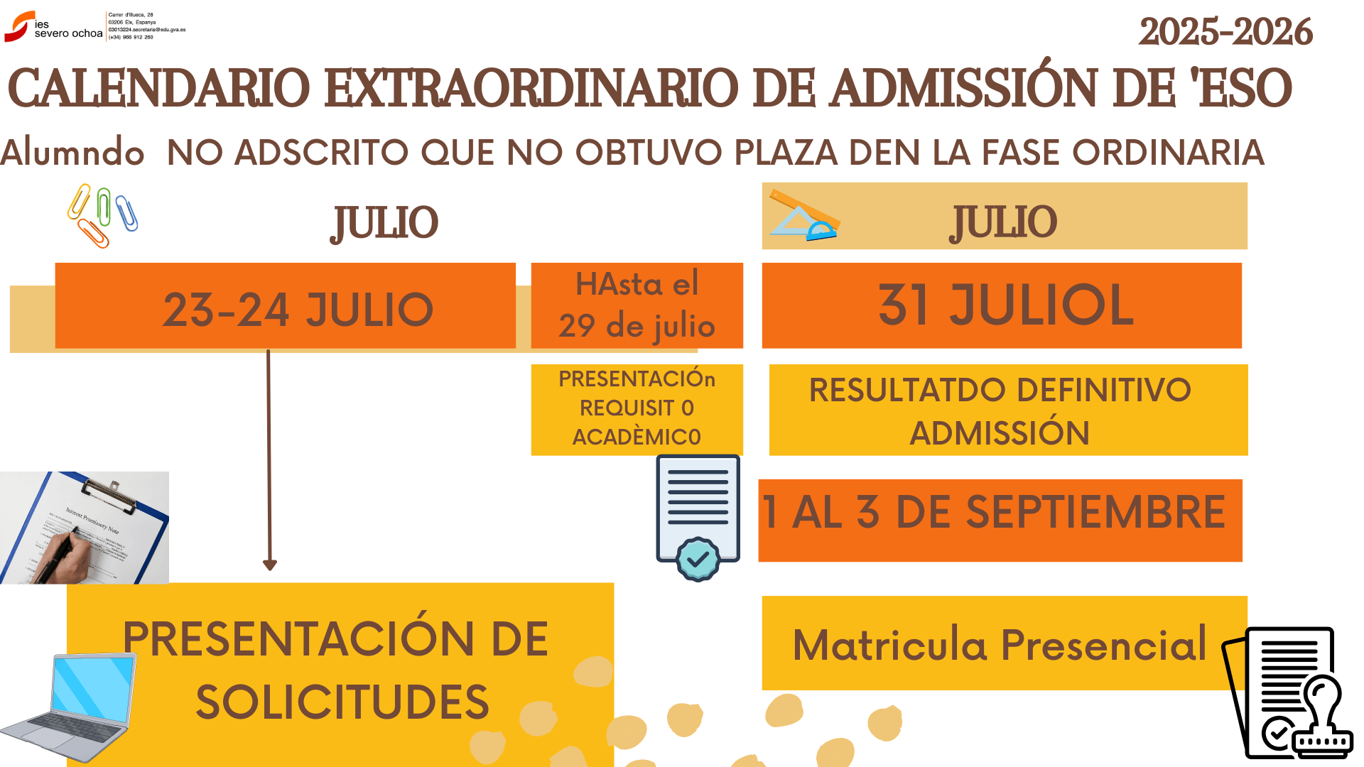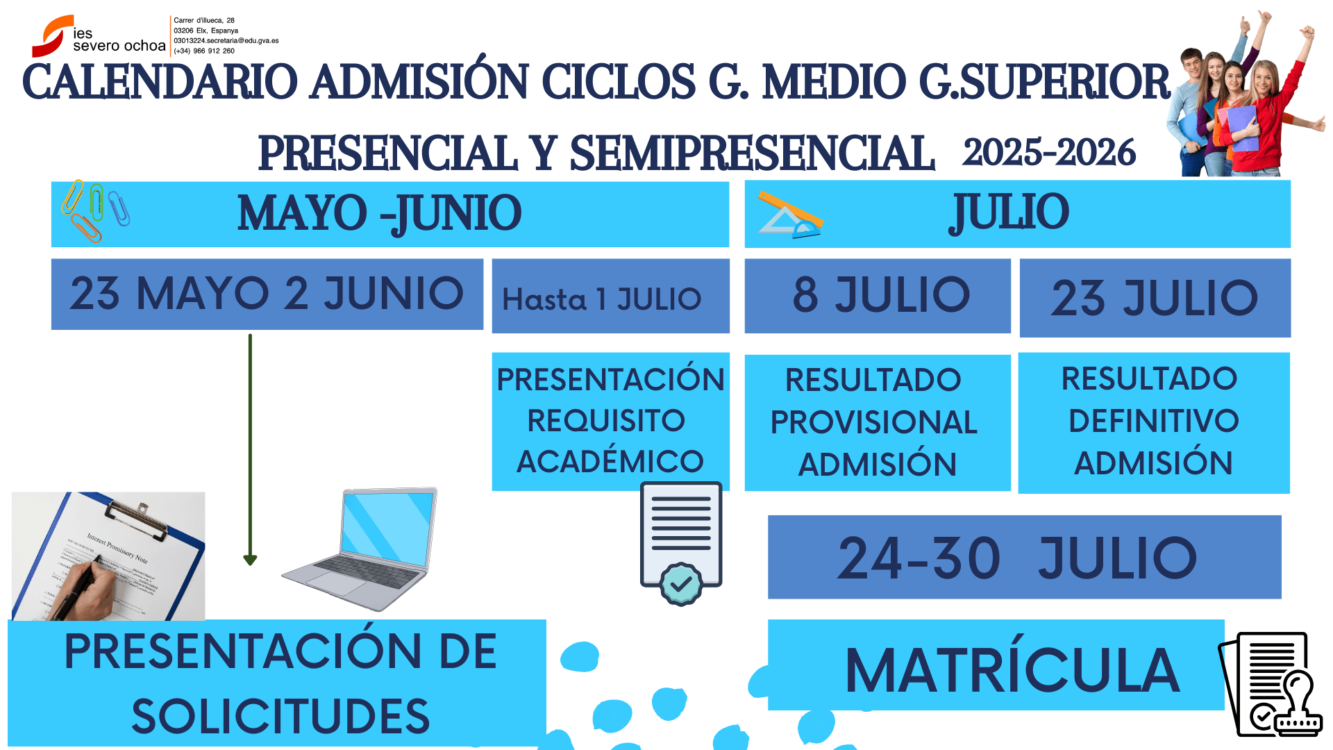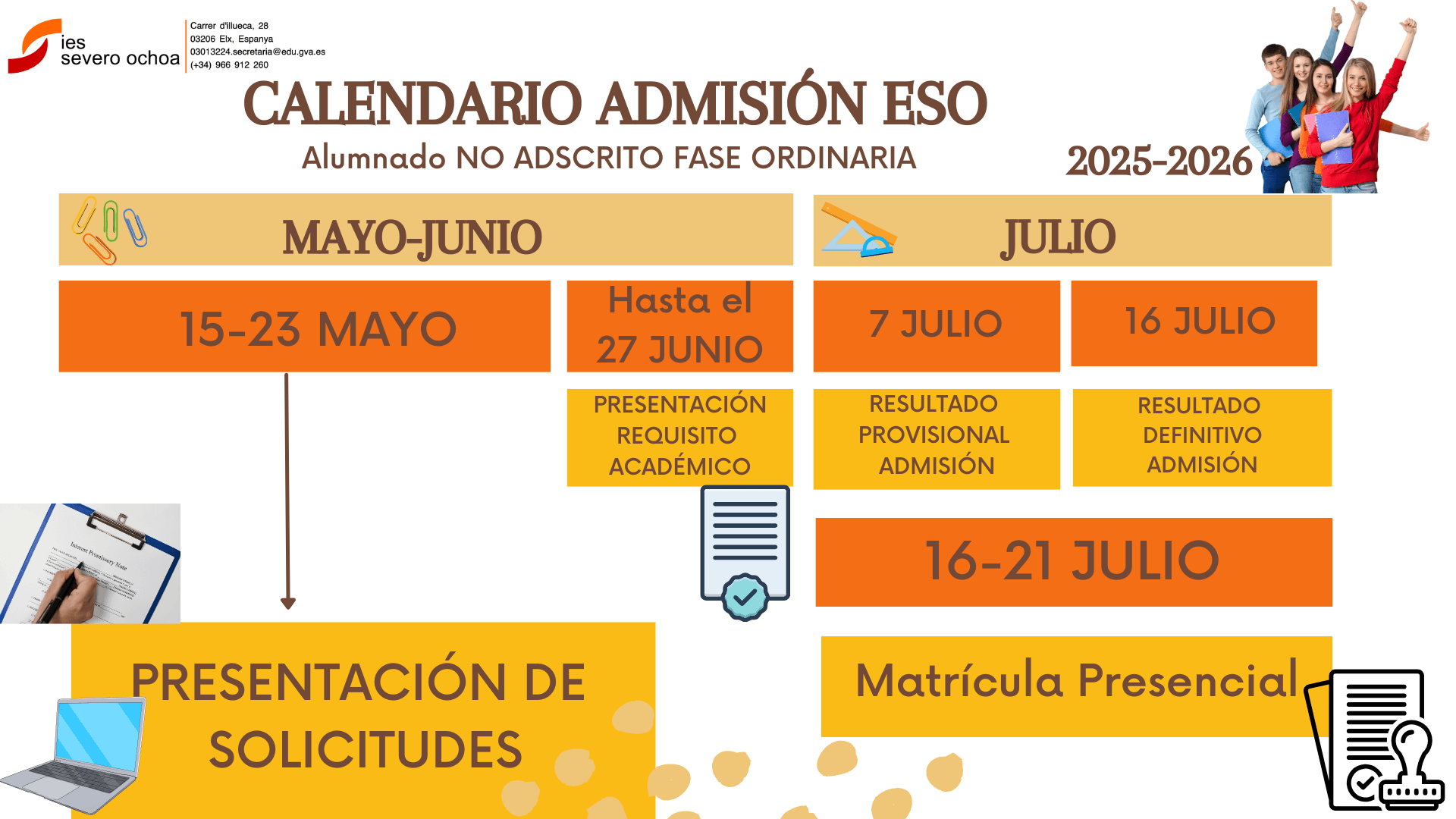Acabado el proceso de Admisión los alumnos que hayan obtenido plaza, recogerán el sobre de matrícula en la conserjería y deberán FORMALIZAR MATRÍCULA en las fechas establecidas entregando la documentación necesaria en el IES SEVERO OCHOA.