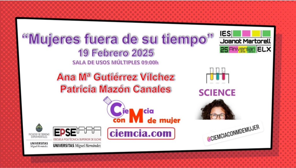 El 11 de febrero se celebró el Día Internacional de la Mujer y la Niña en la Ciencia, nuestro centro ha organizado la charla ”Mujeres fuera de su tiempo” con motivo de dicha celebración. La conferencia ha sido impartida por Ana Gutiérrez y Patricia Mazón, profesoras e investigadoras de la Universidad Miguel Hernández (UMH), quienes ofrecieron una perspectiva reveladora sobre la historia y biografía de las primeras mujeres relacionadas con la ciencia.