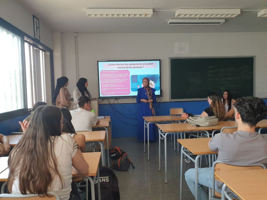 Ya en mayo, se abordó la problemática de la islamofobia y su especial incidencia en las mujeres jóvenes. En la clase de psicología de 1.º de bachillerato, el alumnado escuchó el testimonio, valiente y en primera persona, de la estudiante responsable de esta intervención, que acompañó su charla con una presentación digital que podéis ver en el enlace: