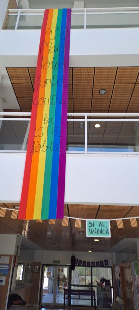 Avui hem celebrat el dia contra la LGTBIfòbia. El Racó Lila hem preparat un acte en el que hem tret els llibres de la biblioteca lila amb temàtica LGTBI perquè pugueren agafar-los en prèstec, hem regalat polseretes i hem desplegat la bandera del col.lectiu a l’entrada del centre.
