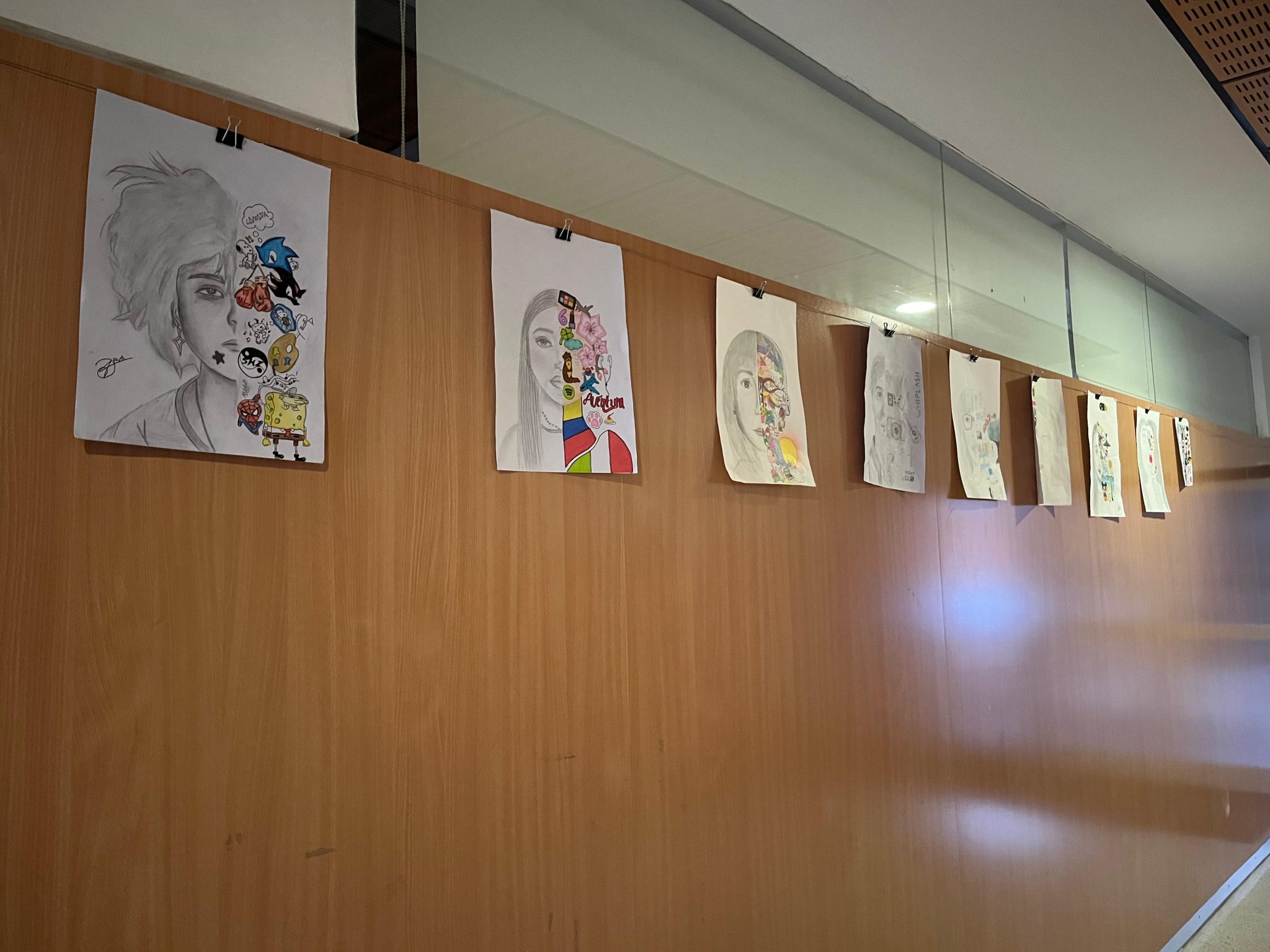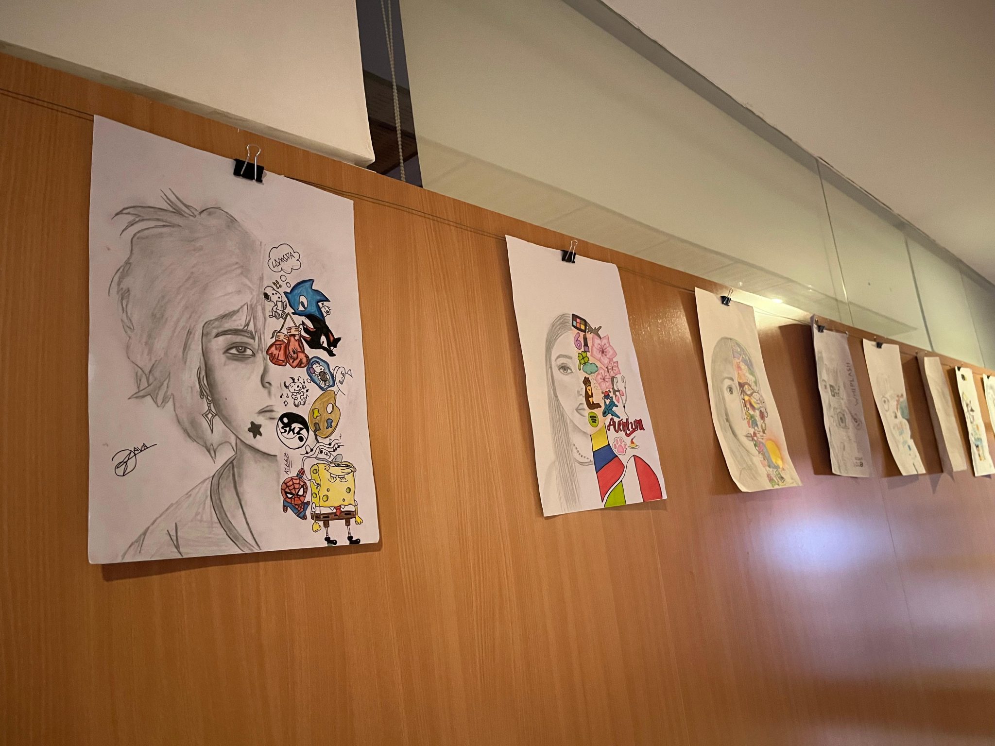 L’alumnat d’Expressió artística de 4t d’ESO i del PDC han preparat una exposició molt interessant, on es conjuga la seua personalitat i el seu físic, i que llueix al corredor del centre. En l’exposició es pot apreciar el talent de l’alumnat i el gran treball realitzat en aquesta assignatura artística. El departament de música s’ha sumat a la presentació inaugural de l’exposició amb una magnífica actuació musical de les alumnes de l’optativa de Música de 4t d’ESO, Sara Alemany i Amelia Escrivà. La presentació ha anat a càrrec de Carla Martos, que ha inaugurat l’exposició i ha convidat tothom a gaudir de l’art. Totes tres cursen les assignatures optatives d’expressió artística i música.