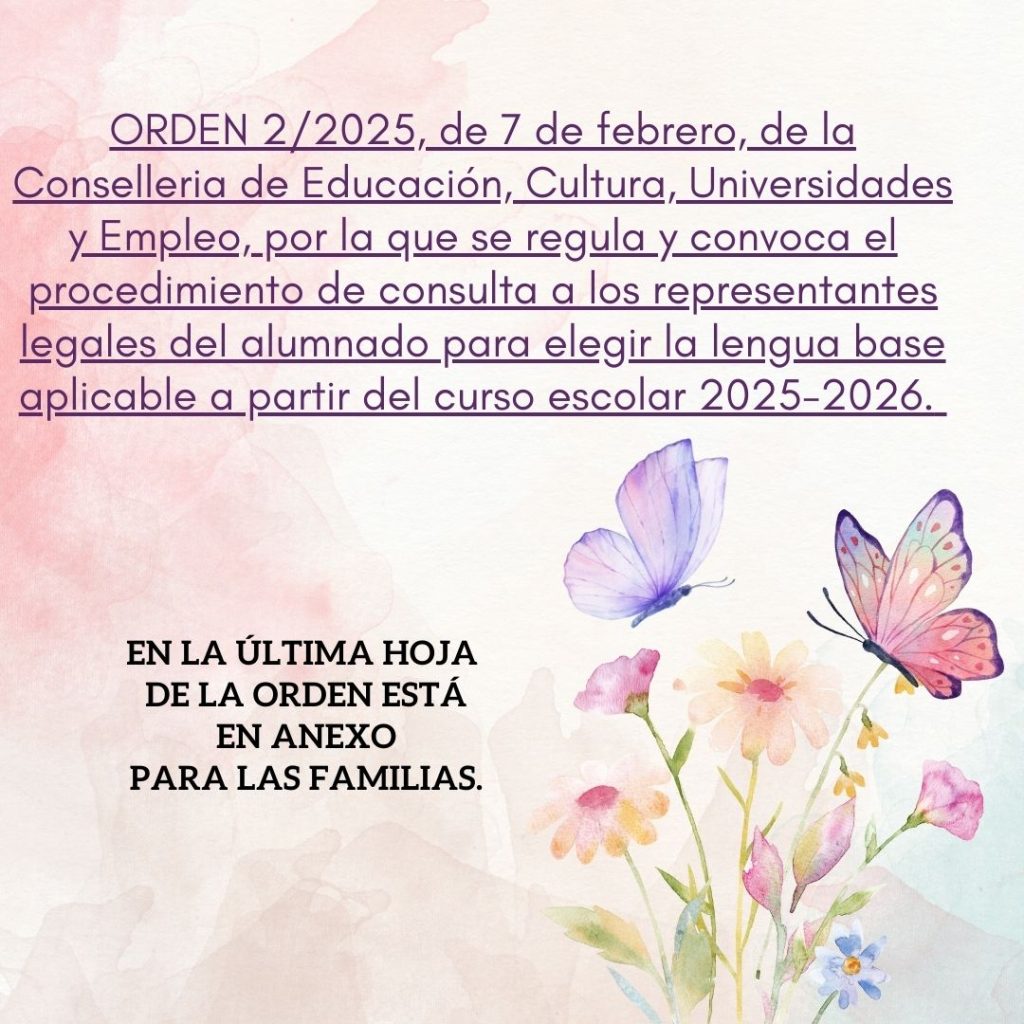 - ORDEN 2/2025, de 7 de febrero, de la Conselleria de Educación, Cultura, Universidades y Empleo, por la que se regula y convoca el procedimiento de consulta a los representantes legales del alumnado para elegir la lengua base aplicable a partir del curso escolar 2025-2026.