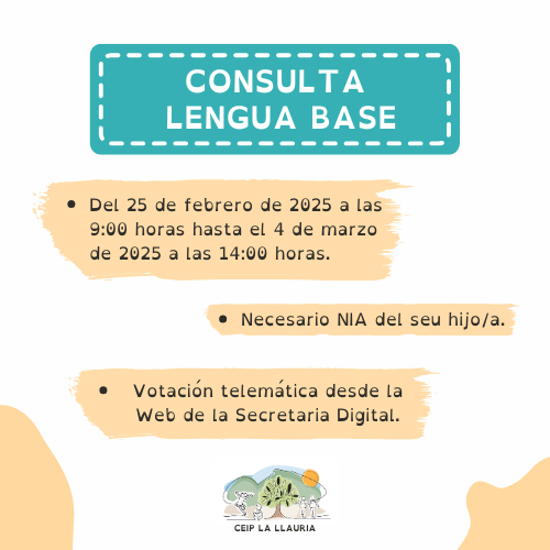Des del 25 de febrer de 2025 a les 9:00 hores fins al dia 4 de març de 2025 a les 14:00 hores podreu participar en la consulta per a triar la llengua base per a cada un dels vostres fills/es matriculats en el centre. Serà suficient amb la votació d’un representant legal per cada fill/a.