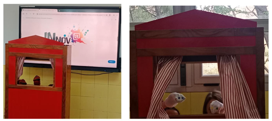 En el segon, teatre de guinyol, van representar una obra pròpia improvisada basada en “El món en un calaix”, d’Adrián Novella. Els xiquets i les xiquetes, per mitjà d’un calcetí convertit en titella, contaven la història ( inventada per cada u) de com va desaparéixer la parella de cada calcetí. El fet de convertir un calcetí desemparellat en una marioneta, amb l’ajuda d’uns *gomets, implica utilitzar tots els recursos ( ús de la veu, dels silencis….) treballats en el taller anterior, i els permet als més tímids actuar amb menys limitacions.