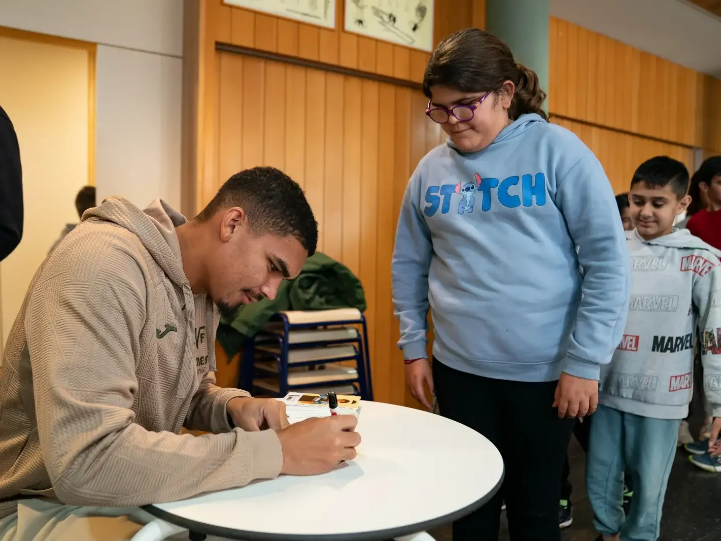 Després de la benvinguda, alumnat i esportistes es van traslladar a l’aula multiusos, on va tindre lloc una trobada pròxima i participativa. Luiz Júnior i Mar Segarra van respondre les preguntes de l’alumnat, compartint experiències sobre la seua trajectòria esportiva, el treball diari d’un futbolista professional i la importància de l’esforç, la constància i els valors dins i fora del camp. En acabar, van signar autògrafs i es van fotografiar amb l’alumnat, deixant un record inesborrable per a molts d’ells i elles.