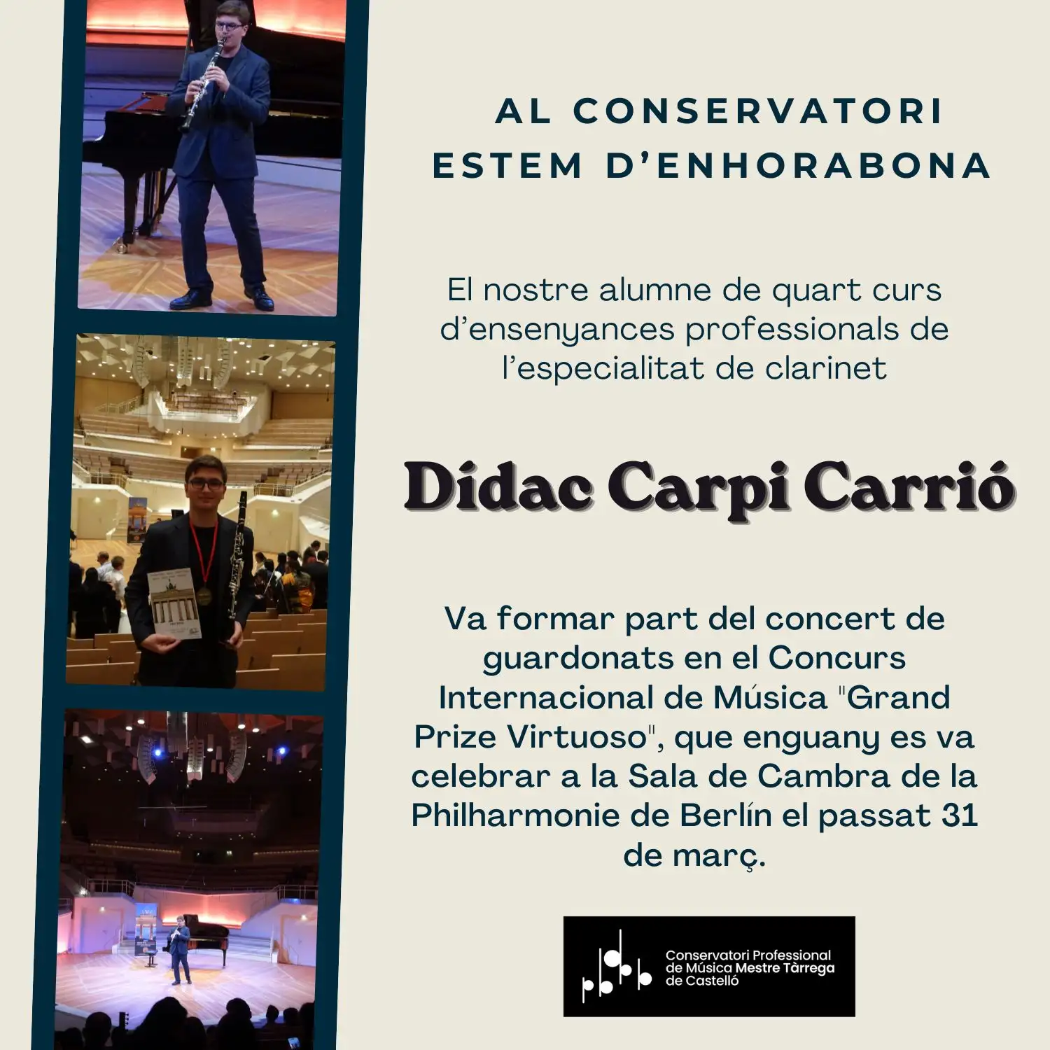 El passat 4 de març vam viure un concert molt especial al Casino Antic de Castelló amb motiu del Dia de la Dona. Va ser una vesprada plena d’emoció i talent, on l’alumnat va demostrar el seu alt nivell musical i la seua capacitat de transmetre a través de l’art. El programa, dedicat íntegrament a … Llegir més