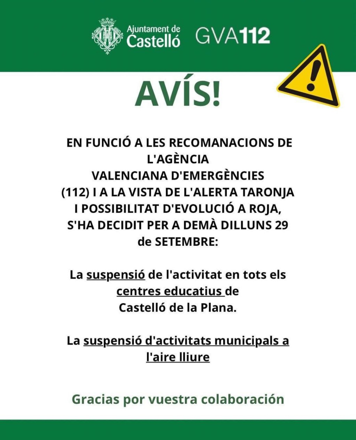 A causa de la previsió de fortes tempestes i seguint les indicacions oficials, se suspenen les classes durant tota la jornada del dilluns a Castelló.