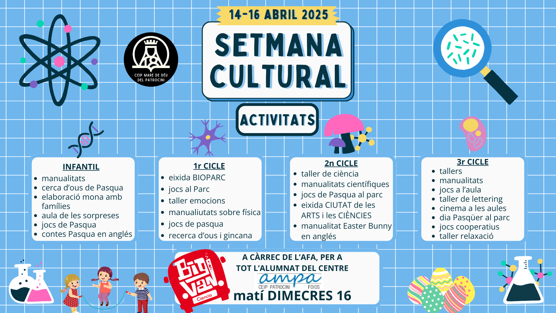 LA SETMANA DEL 14 AL 16 D’ABRIL GAUDIREM DE LA SETMANA CULTURAL! ESTARÀ PLENA D’ACTIVITATS, EIXIDES, JOCS, TALLERS I MOLTES COSES MÉS RELACIONADES AMB LA CIÈNCIA, ELS JOCS TRADICIONALS DE PASQUA, CONVIVÈNCIA I EMOCIONS. QUAN ACABE LA SETMANA PODREU VORE UN RESUM A L’APARTAT DE CELEBRACIONS. EXPERIMENTA EL NOU CURS!
