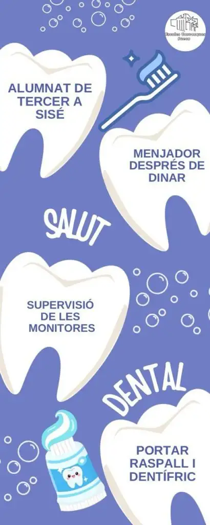 Els/les alumnes necessiten portar a l’escola un necesser MENUT amb el NOM i dins un raspall i dentífric per dur a terme esta activitat de forma organitzada i supervisada per les monitores del menjador. El necesser es quedarà a l’escola.