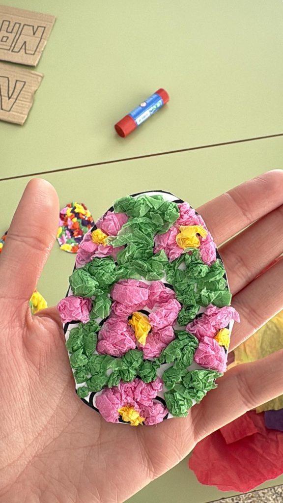 Usando papel de seda de diferentes colores, decoraron una figura con forma de huevo de Pascua. Cada alumno arrugó y pegó pequeñas bolitas de papel de colores sobre el contorno del huevo 🥚