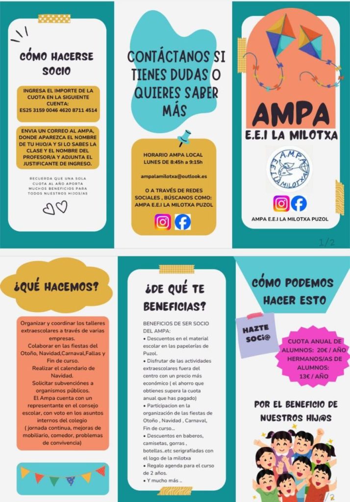 Queremos presentarnos, el AMPA del colegio la Milotxa es una asociación sin ánimo de lucro, somos un equipo de padres y madres que trabaja activa y gratuitamente. Somos voluntarios que dediquemos parte de nuestro tiempo personal para intentar resolver los problemas que afecten nuestra comunidad educativa, os representemos como padres y madres en el consejo escolar. Desde el AMPA os animamos a conocer las actividades que basura y los servicios que proporcionamos: