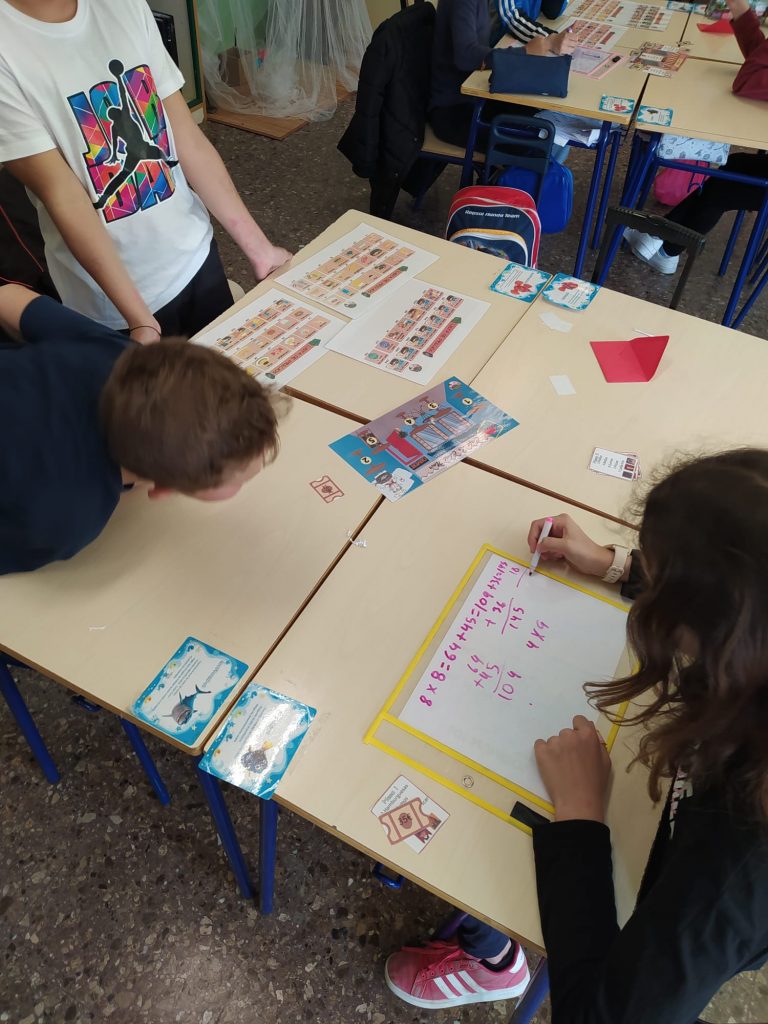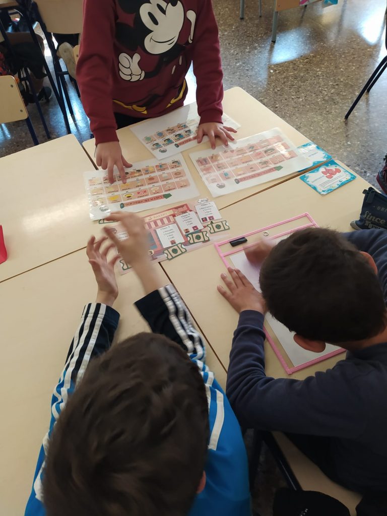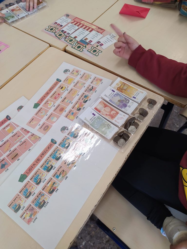 Para familiarizarnos con el dinero, realizamos la actividad «Kaos en el restaurante». El alumnado tenía que averiguar la cantidad total que había gastado cada mesa, trabajando también el cálculo mental, para después representarla con dinero.