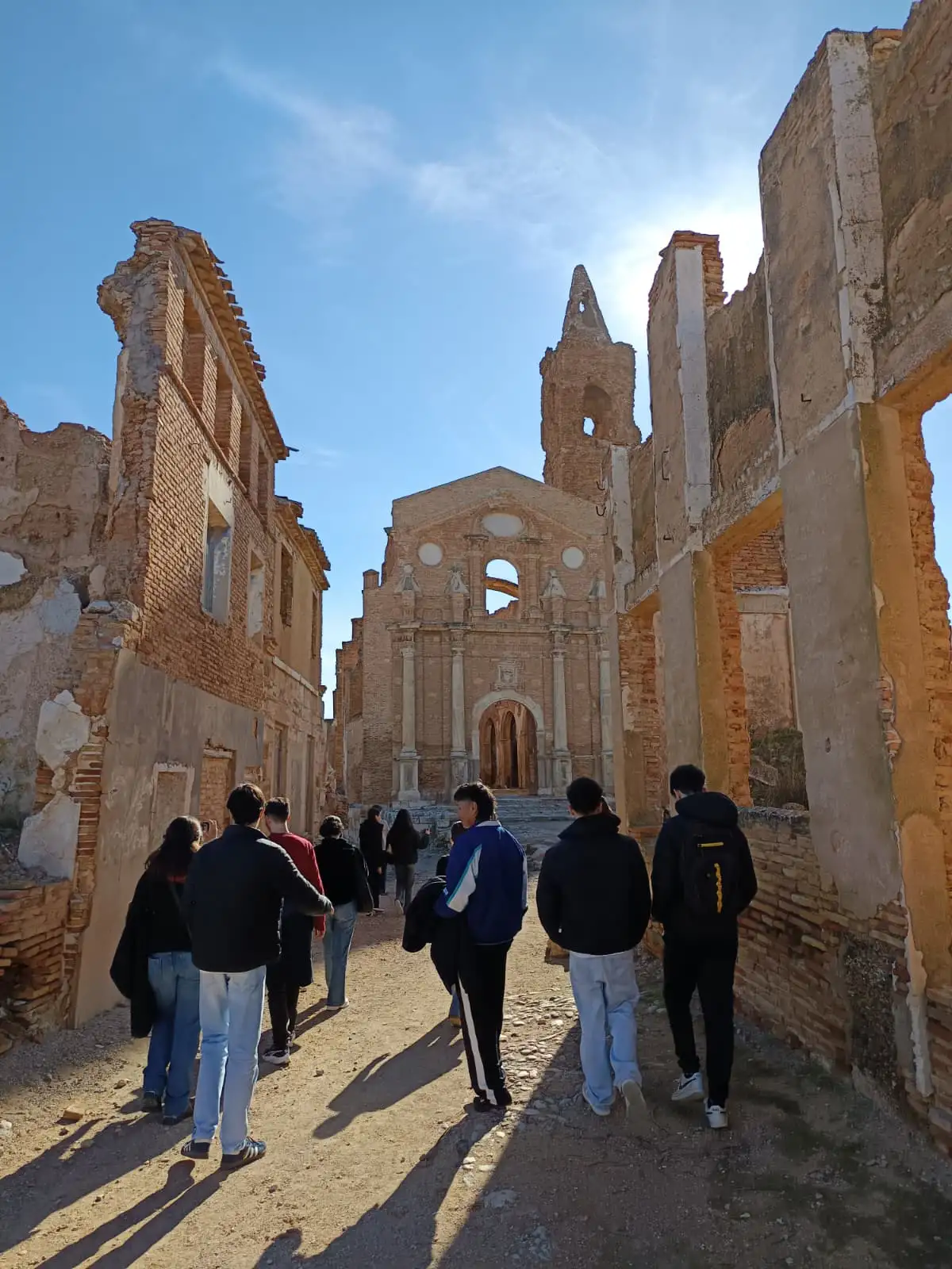Els dies 21 i 22 de febrer, 33 alumnes de segon de Batxillerat vam fer una eixida a Saragossa amb l’objectiu d’aprofundir en el temari d’Història. Actualment estem estudiant la Segona República, la Guerra Civil Espanyola i la dictadura franquista, i aquesta excursió ens va permetre analitzar la història no sols des dels llibres, sinó també des del terreny, davant d’una font històrica directa: les runes de Belchite Vell.