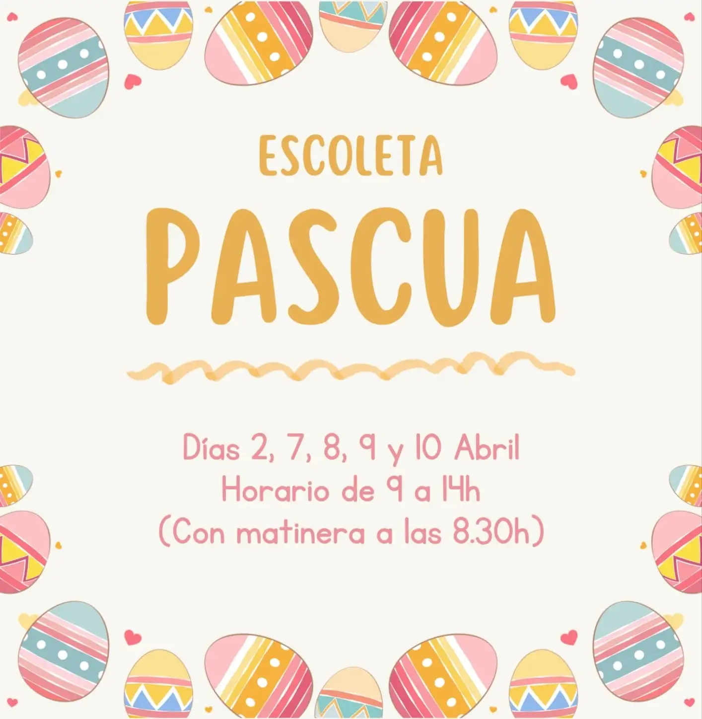 ¡Hola familias! Os informamos que la escuela de Pascua sale adelante. 😊 También habrá opción de mañanera a las 8:30h. 📍Lugar: CEIP Mare de Déu del Patrocini. 📍 Días: 2, 7, 8, 9 y 10 de abril.