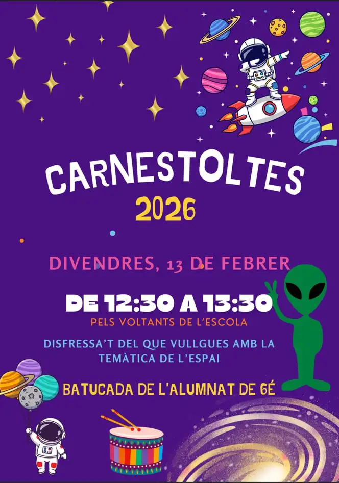 Aquest curs la temàtica es “L’ESPAI” i haurem de vindre disfressats d’algo relacionat amb la temàtica (astronauta, extraterrestre, nau espacial, OVNI, planetes, estrela…