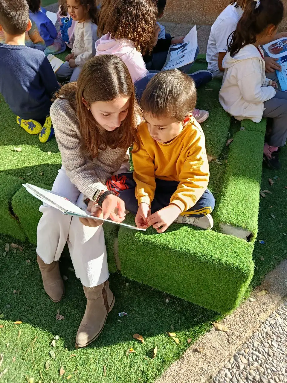 Las sesiones se desarrollan en un entorno agradable y al aire libre, donde el alumnado disfruta del placer de leer y de escuchar historias. De este modo, fomentamos el hábito lector, la convivencia y los vínculos entre el alumnado de diferentes edades.