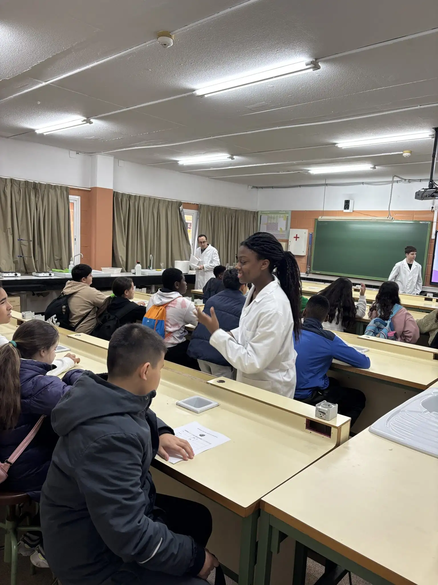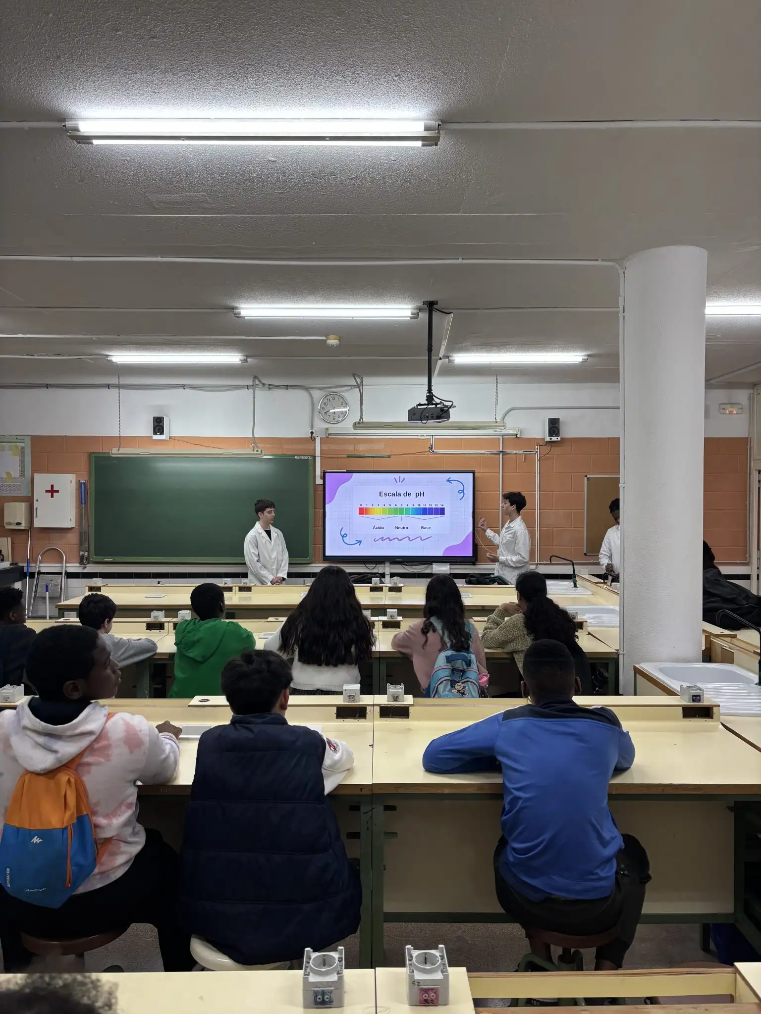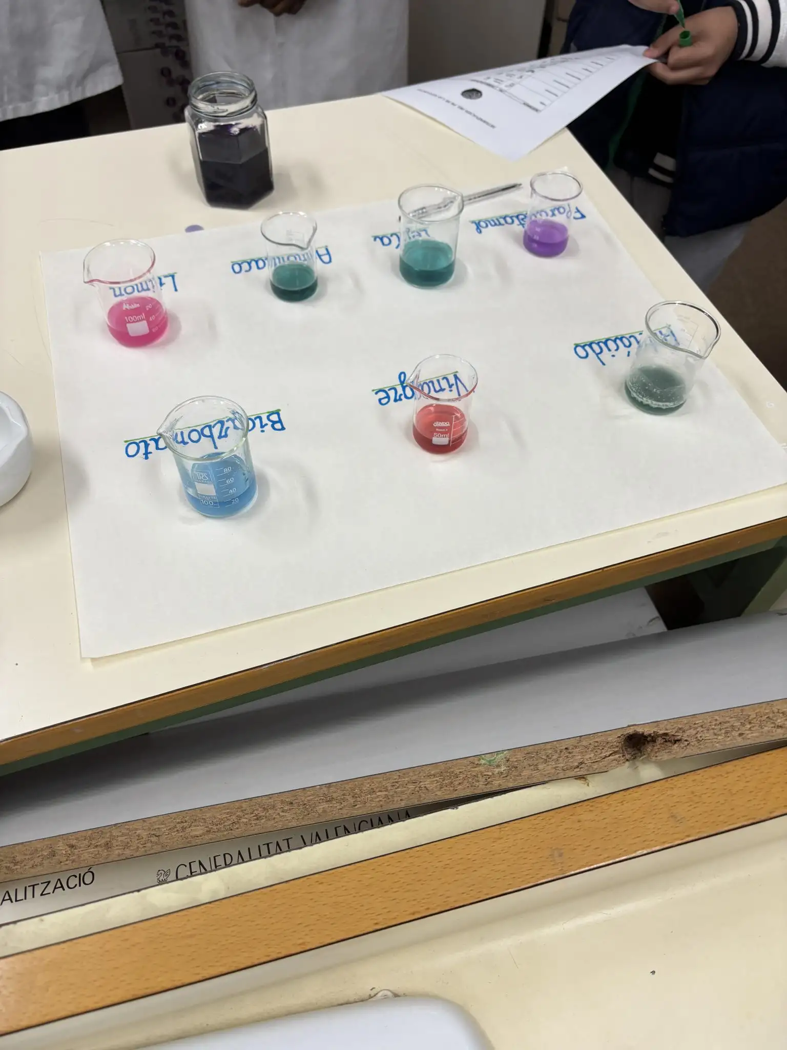 El recorregut ha continuat al laboratori de Química, un espai que sempre desperta curiositat. En aquesta ocasió, han manipulat diversos materials i els han classificat entre àcids i bases, una pràctica senzilla però efectiva per a introduir conceptes que treballaran més endavant.