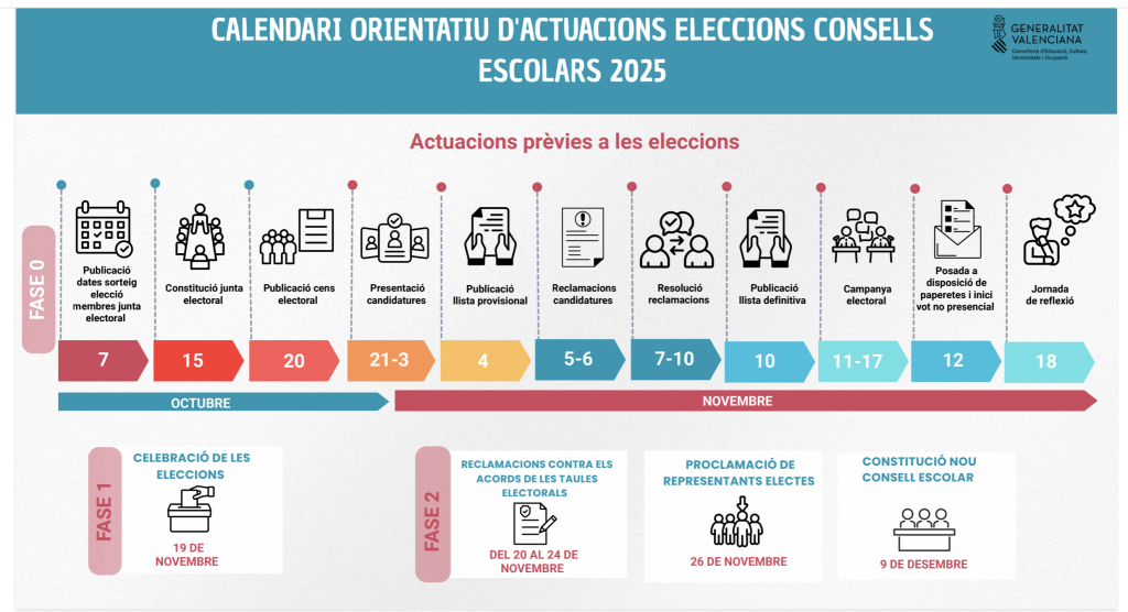 El dimecres 19 de novembre de 2025 es celebren Eleccions al Consell Escolar del centre educatiu. Alumnat, professorat i mares/pares d’alumnes tenim un cita amb les urnes per a elegir als representants en el màxim òrgan de govern de l’institut. A continuació pots consultar els detalls del procès electoral. Comptem amb la teua participació!