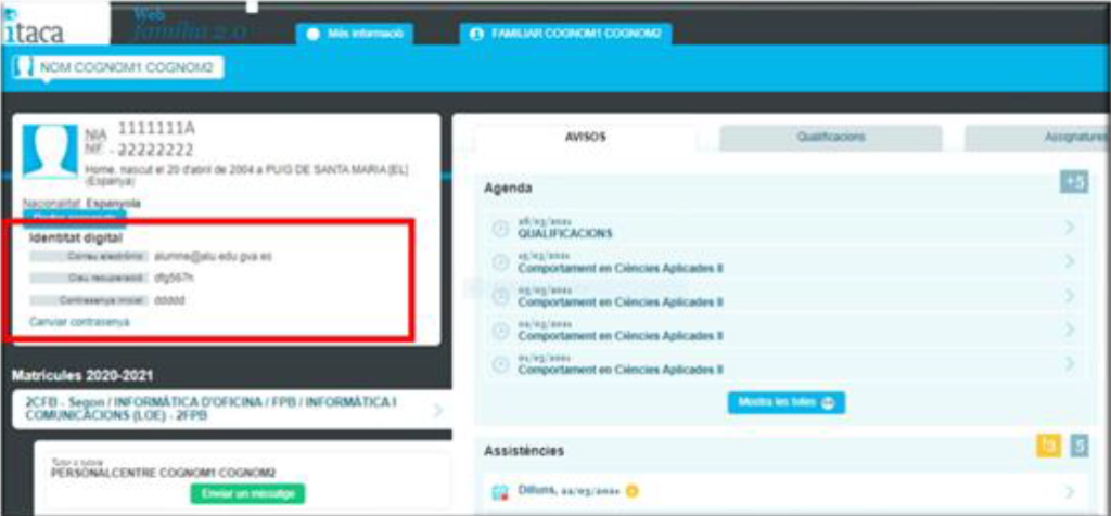 1) Consulta en Web Familia la teua adreça de correu i la contrasenya inicial