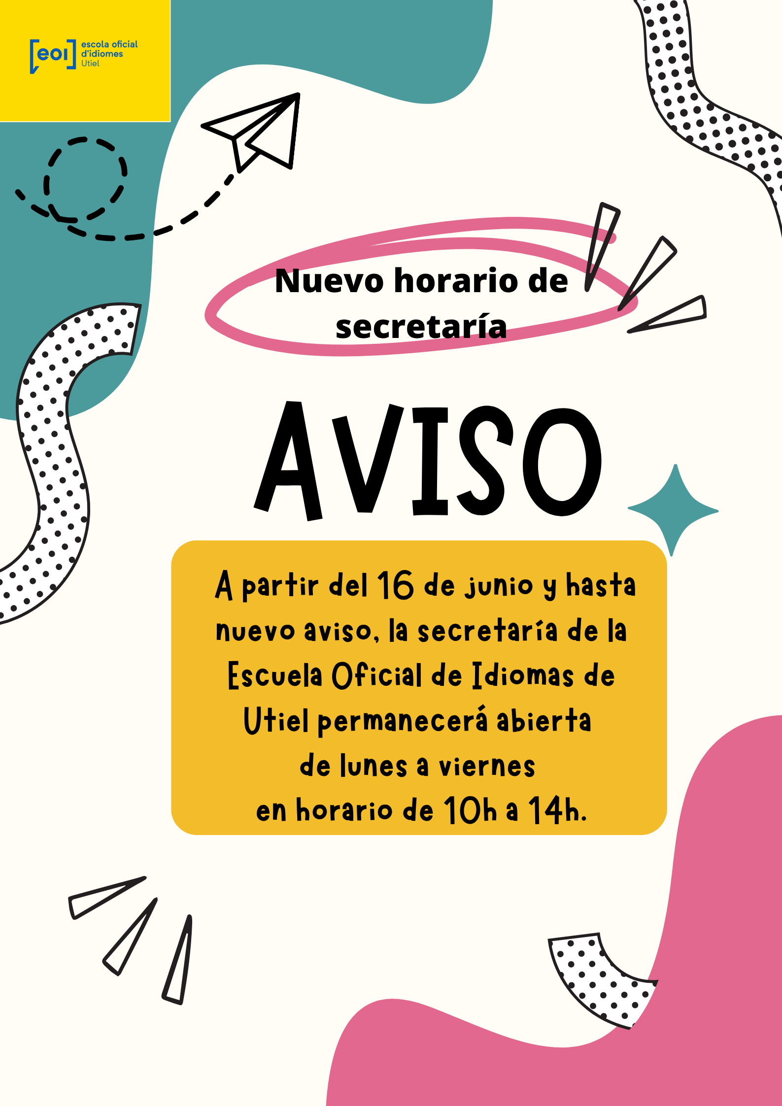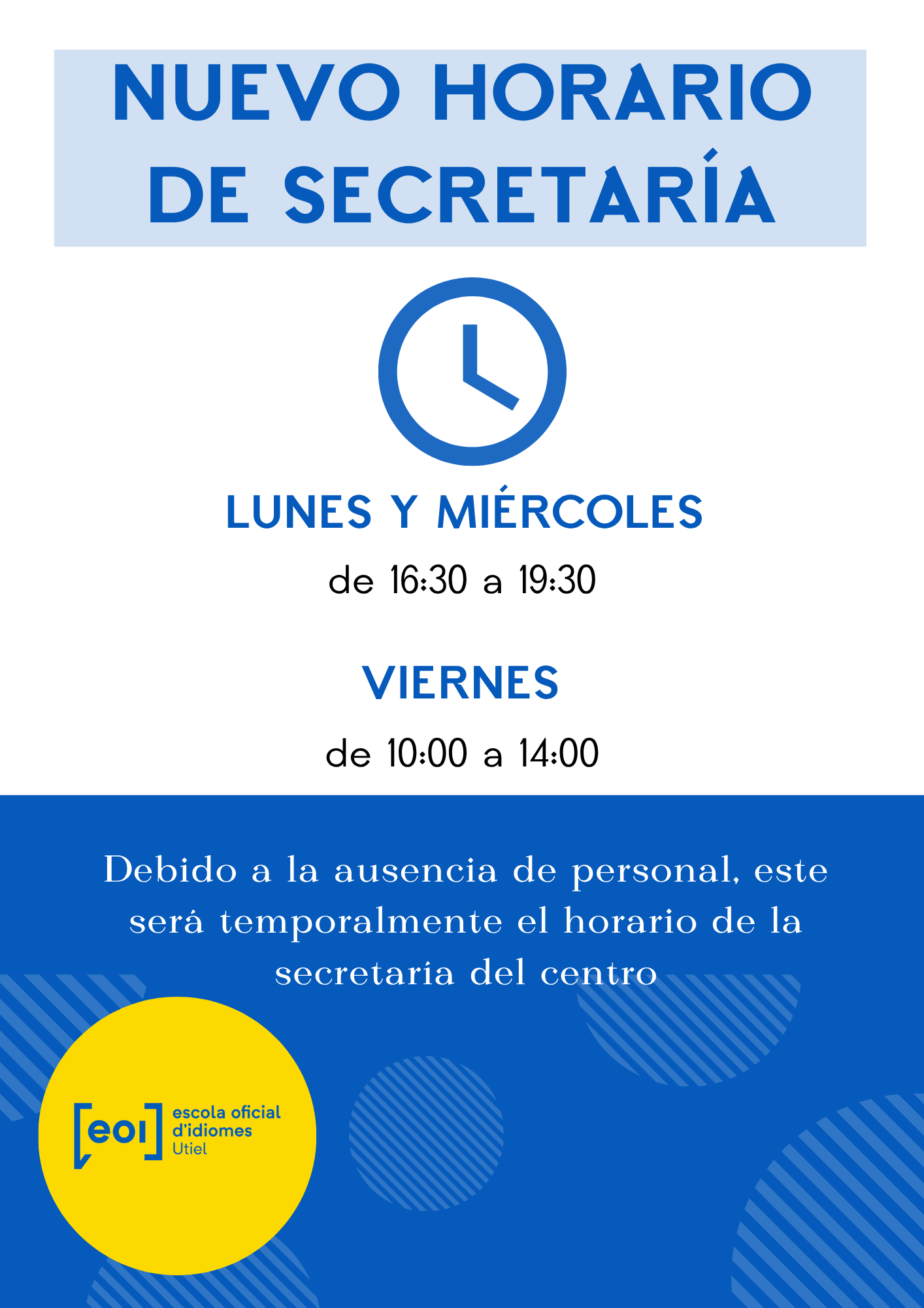 Debido a la ausencia de personal, el horario de la secretaría del centro será temporalmente: lunes y miércoles de 16:30 a 19:30 y viernes de 10:00 a 14:00. Disculpad las molestias.