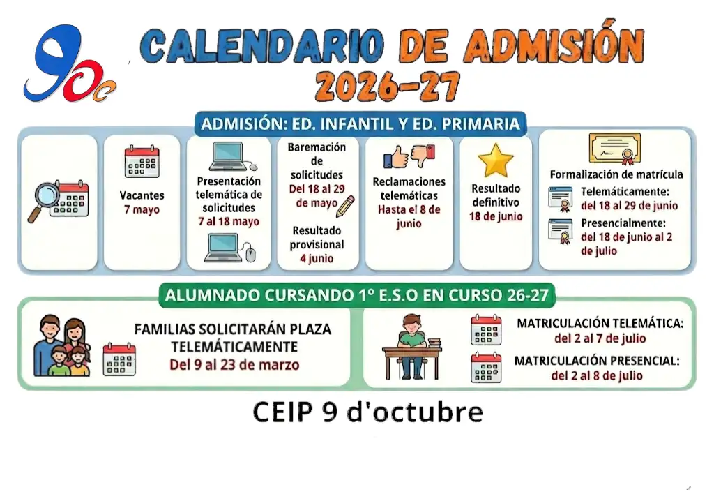 A continuación os dejamos el calendario de admisión y matrícula para el próximo curso 2026/2027 y la circustancia específica determinada por el centro y que otorga un punto más en la baremación de solicitudes de admisión.