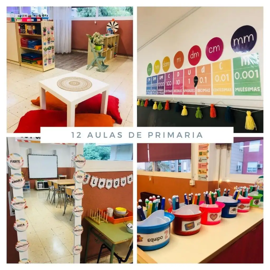 También contamos con 12 aulas de Educación Primaria: 2 aulas por cada nivel. Estas aulas son muy amplias y permiten que el alumnado pueda trabajar en equipos cooperativos y, además, disponer de diferentes rincones: alfombra, rincón de lectura, rincón de juegos…