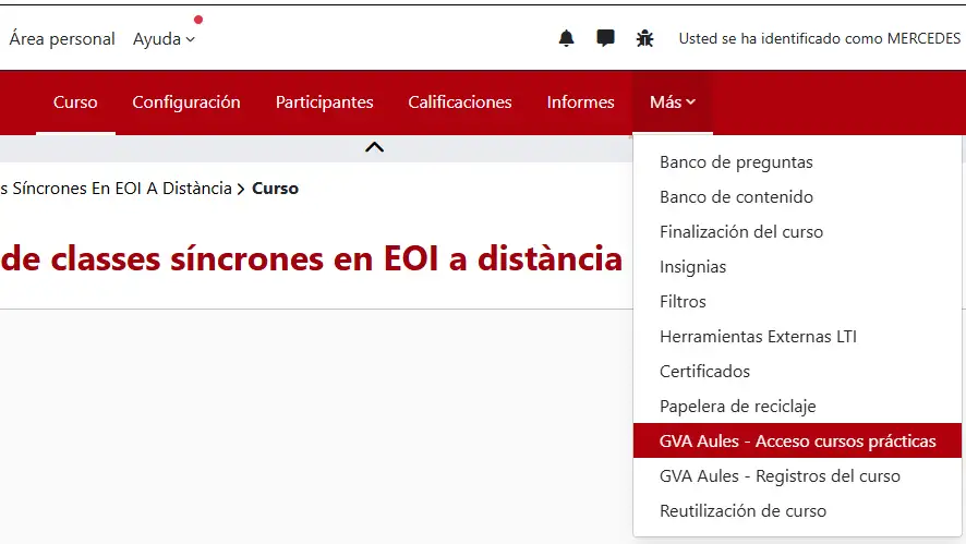 Teniendo un curso con Zona de prácticas, accedemos a esta opción desde desde «Más / GVA Aules – Acceso cursos prácticas»