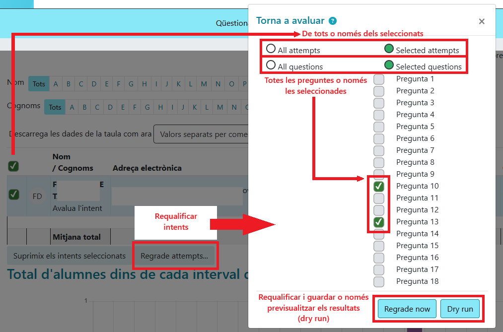 Recalificar todas las preguntas del cuestionario, o solamente las seleccionadas.