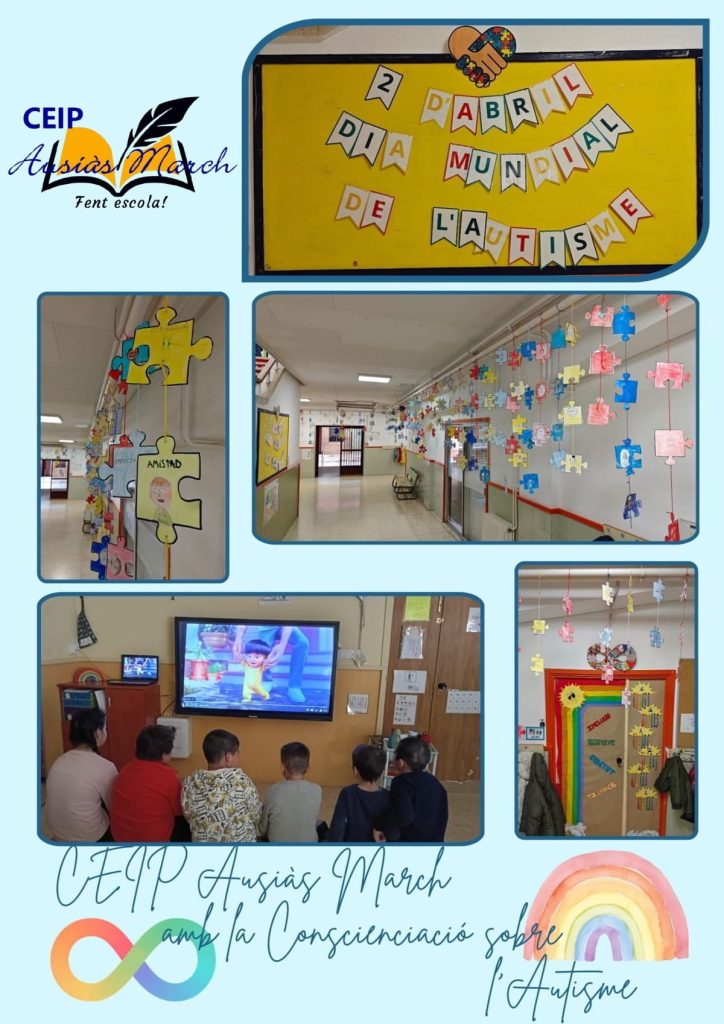 Al nostre Centre, el dia 2 d’abril sempre el recordem com el Dia Mundial de la Conscienciació sobre l’Autisme. Es converteix en una setmana on programem activitats i les duguem avant amb l’alumnat tant d’Educació Infantil com de Primària. Activitats: - Visió de dos curtmetratges on més tard s’ha fet una reflexió global sobre qüestions plantejades i altres que han sorgit de manera espontània 🎥 - Tasca manipulativa on han plasmat la seua imatge en una peça de puzle 🧩. Amb açò hem volgut representar que totes les persones som importants i que si falta una peça l’escola no està completa 🏫 Aquests dibuixos han sigut penjats pels corredors i han fet visible la importància de seguir amb la INCLUSIÓ EDUCATIVA que el nostre Centre porta avant 💪🏻 Perquè al CEIP AUSIÀS MARCH creguem i treballem per una inclusió real on totes les persones tenim cabuda ❤️🧡💙💛💜