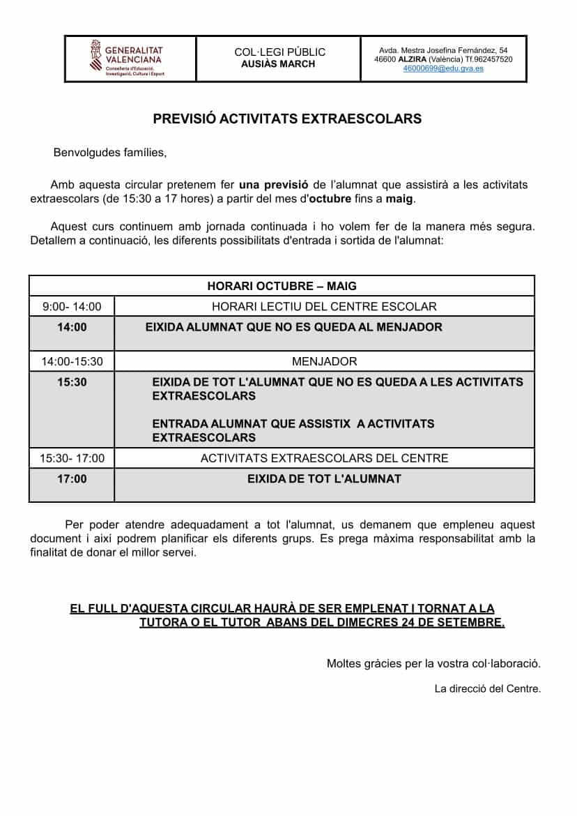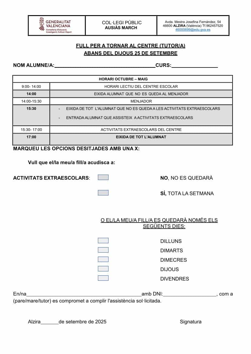 IMPORTANT: Totes les famílies heu d’entregar la fitxa al tutor o a la tutora es quede o no el/la vostre fill/a a les activitats.Gràcies
