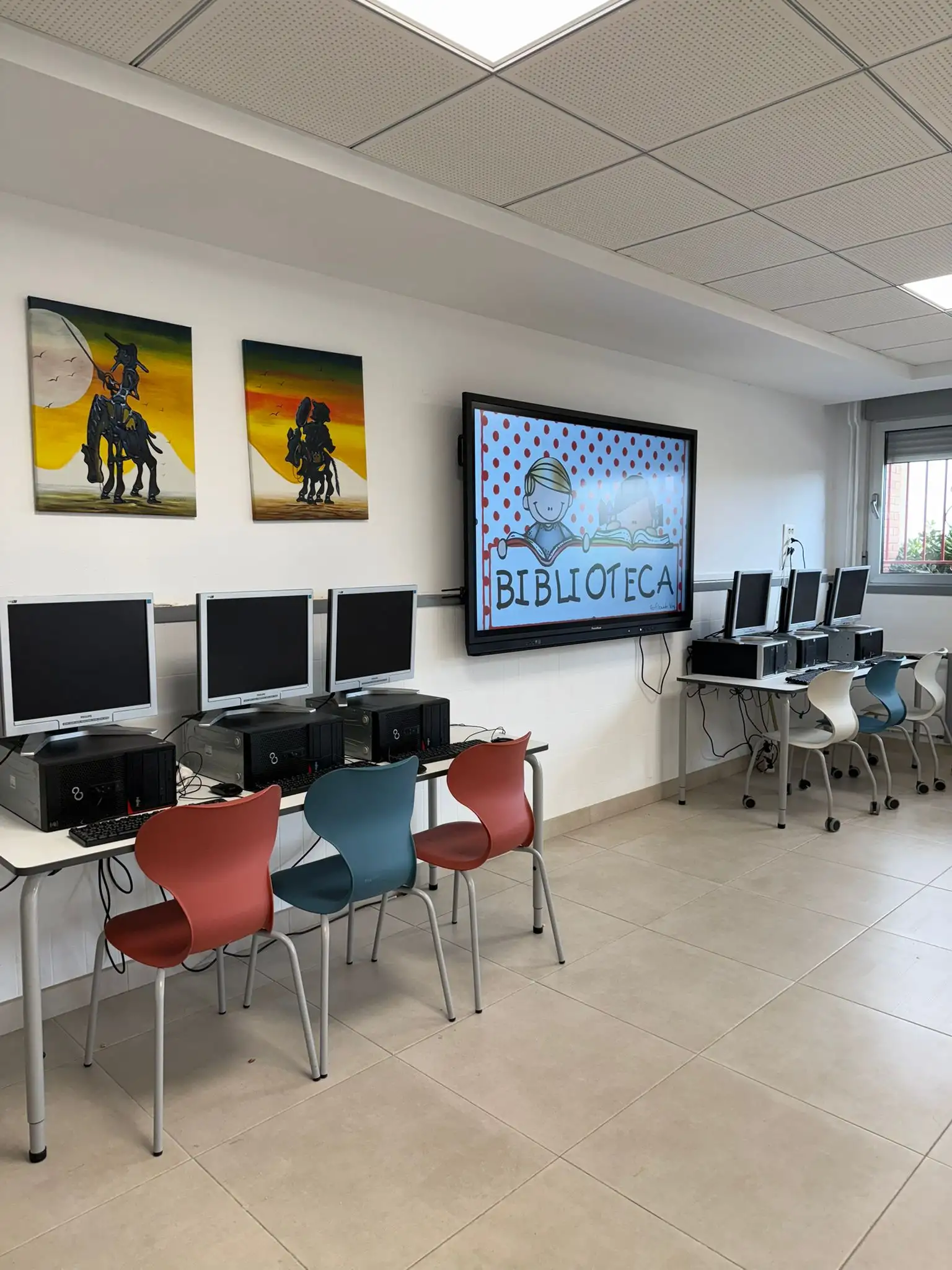 Por otro lado, la biblioteca funciona como un espacio de trabajo con zonas para el trabajo colaborativo, el estudio en grupo y el desarrollo de proyectos de aula o investigaciones guiadas. La oferta se completa con un rincón de informática que facilita trabajos individuales y consultas del alumnado.