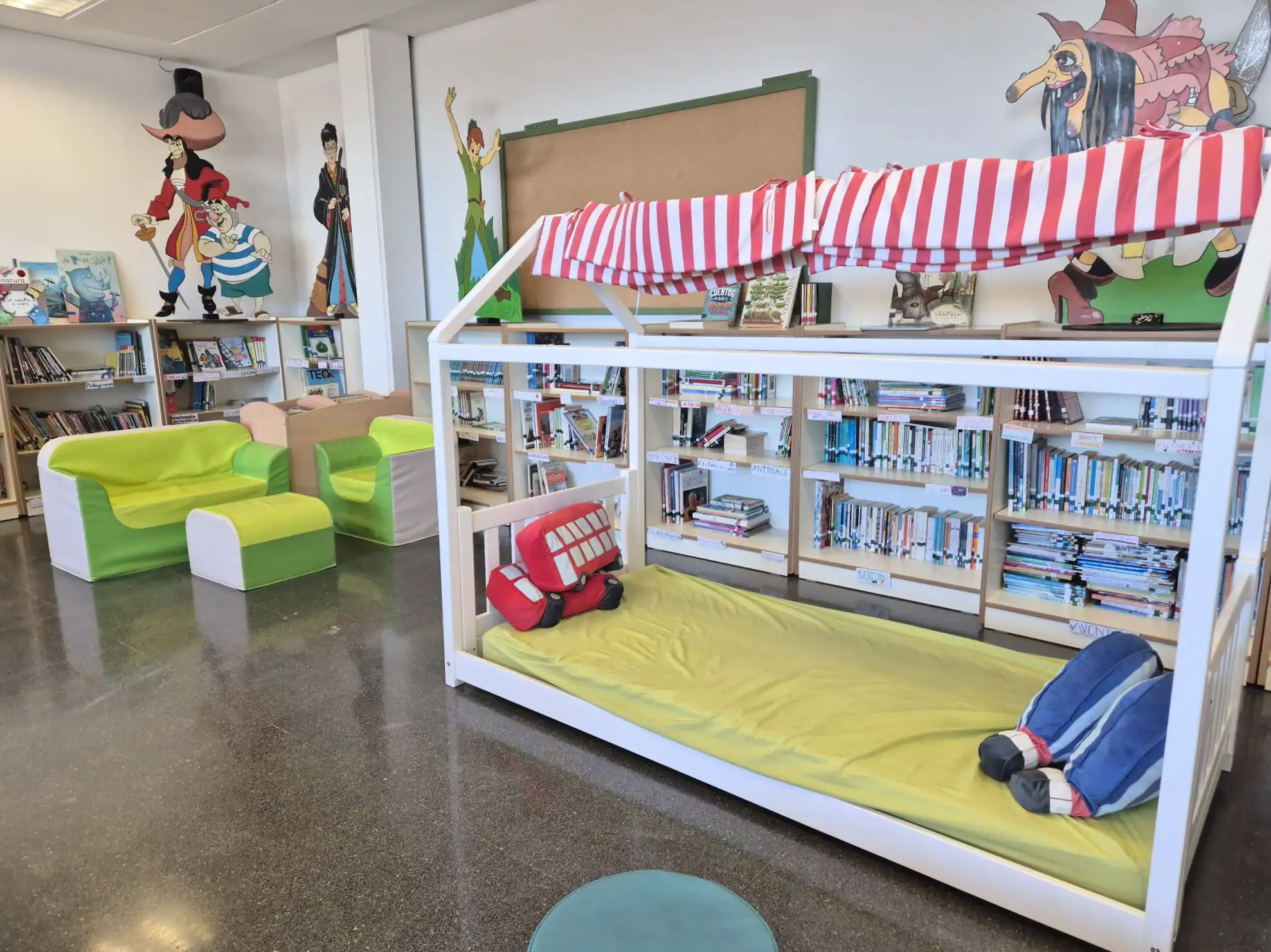 Disposàvem d’una aula gran que, després de la pandèmia, havia quedat dividida en dos mitjançant una paret i una porta corredissa. Aprofitem esta particularitat per a dissenyar una biblioteca amb dos espais complementaris. Un d’ells està dedicat a la narrativa i al plaer lector, pensat per a una lectura tranquil·la i per al gaudi dels llibres. L’altre està orientat al treball cooperatiu, la busca d’informació i la consulta de llibres de coneixement, facilitant així la investigació i l’aprenentatge compartit.