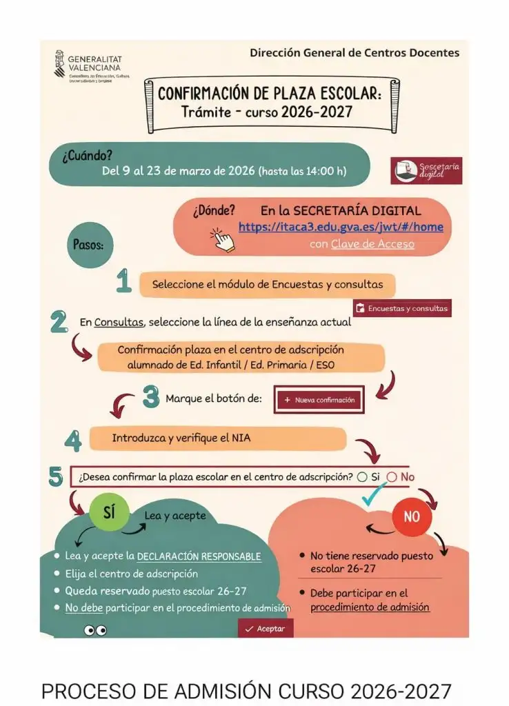 RESOLUCIÓ de 2 de març de 2026, del director general de Centres Docents, per la qual s’establix el calendari i es dicten instruccions respecte al procediment d’admissió de l’alumnat en els centres docents sostinguts amb fons públics de la Comunitat Valenciana que impartixen ensenyances d’Educació Infantil, Educació Primària, Educació Secundària Obligatòria i Batxillerat, i en els centres d’Educació Especial, per a el curs 2026-2027. [2025/6504]