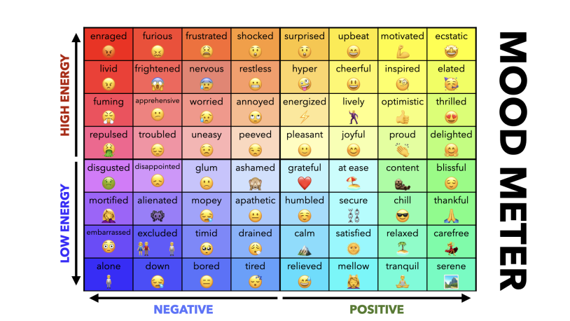 - Emocions: s’escriu una emoció que han sentit, de manera principal, en la classe. Com hem treballat el moodeter, ens servirà per a veure quina és l’energia i la intensitat. Vos deixe a continuació alguns exemples.