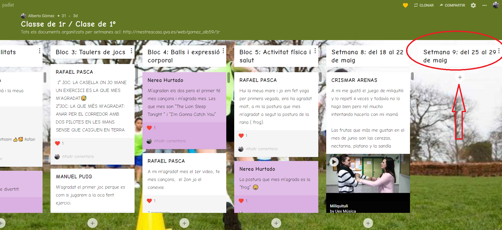 Ahora que ya sabemos cuáles son los 5 bloques principales que componen la educación física, a partir de ahora escribiremos las actividades fijándonos en una nueva columna por semanas, dejando de lado los bloques para las actividades previas. Con la siguiente imagen veréis más claro dónde escribir a partir de ahora: